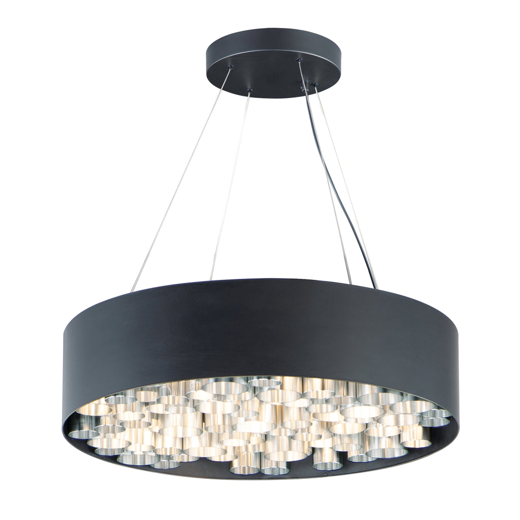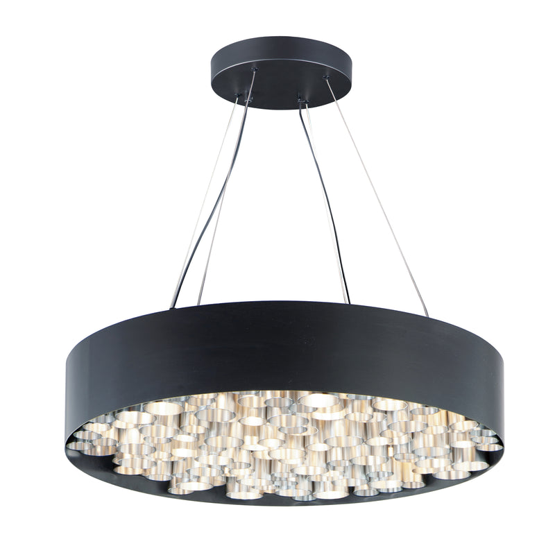 Drums of Black conceal various size Brushed Aluminum tubes which are specially treated to create visual stimulation as the LED light passes through. This exclusive design produces incredible light without glare which adds to the glamor of this unique design.