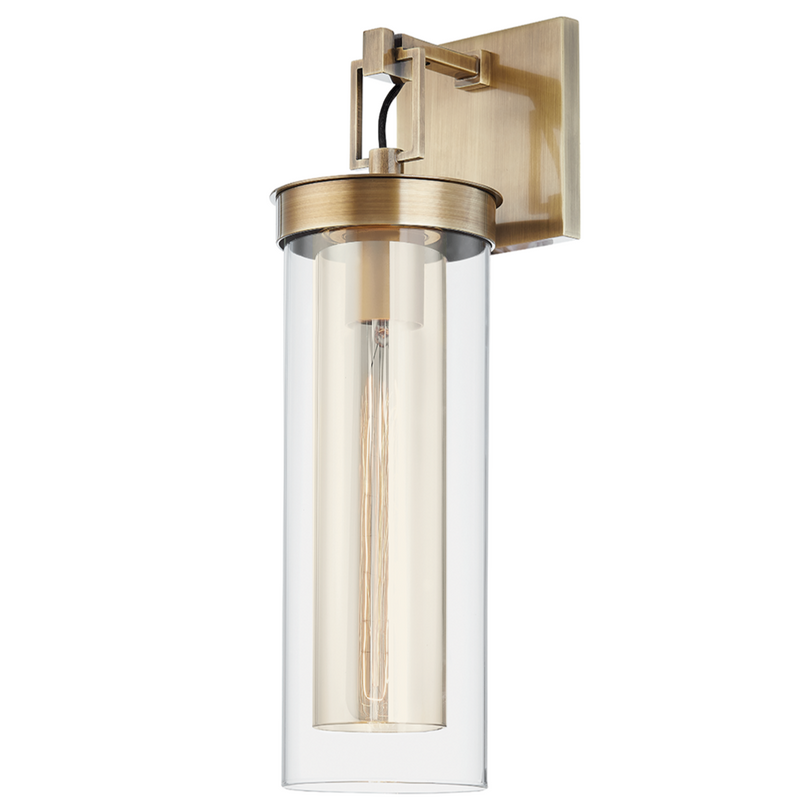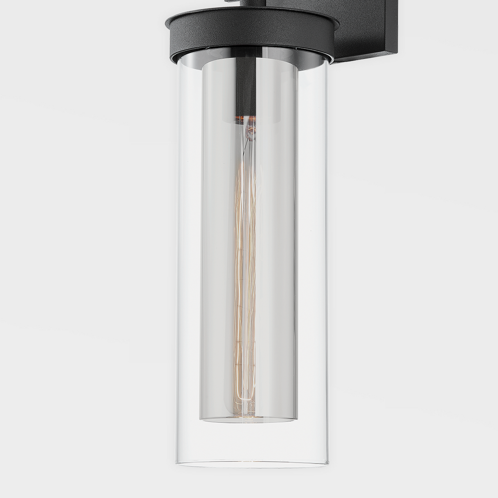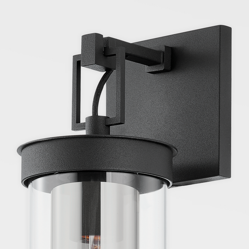 Pira is both upscale and usable. A cylinder of clear glass is layered over a similarly shaped shade of smoked glass, creating an edgy, unique look. The machined-metal details of the square backplate and rectangular arm take this sophisticated sconce to the next level. Available in a patina brass or textured black finish to work with a variety of design styles and spaces.