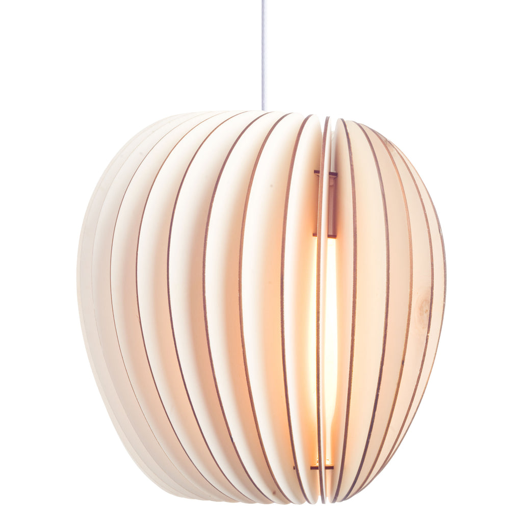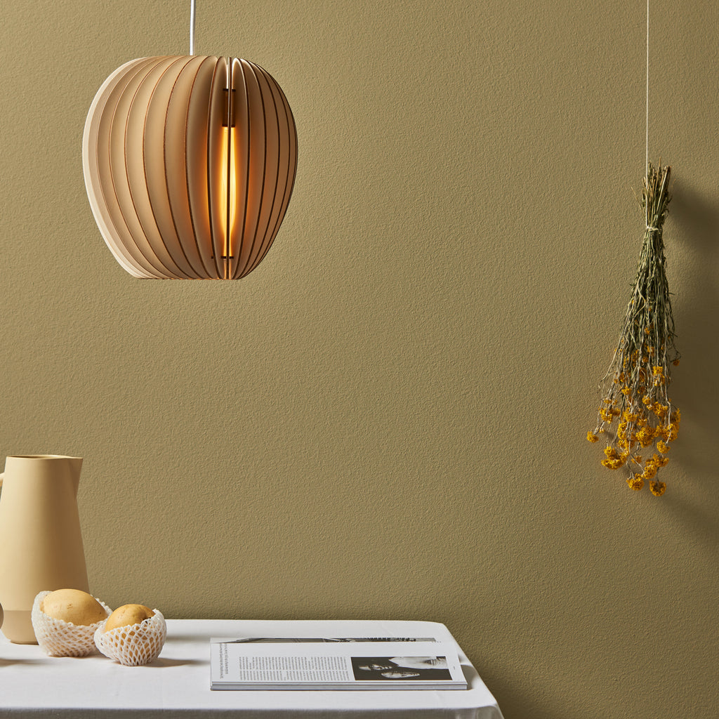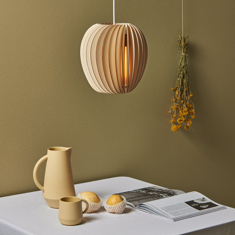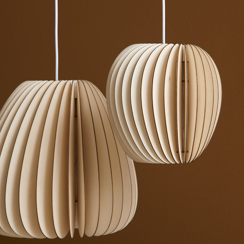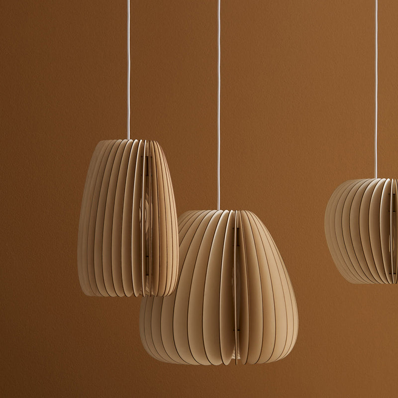 Pirum, Secundum and Volum: Three lamps that stand for naturally warm light. All three lights are constructed by the same principles and yet every lamp stands out with its own special shape and character. The intricate structure of the lamp allows the light to subtly shine through the thin wooden slats and cast a glare-free light which creates a natural ambience. Pirum is the smallest lamp of the Series A and is hand manufactured of untreated, sustainable wood in our own studio in Lübeck, Germany.
