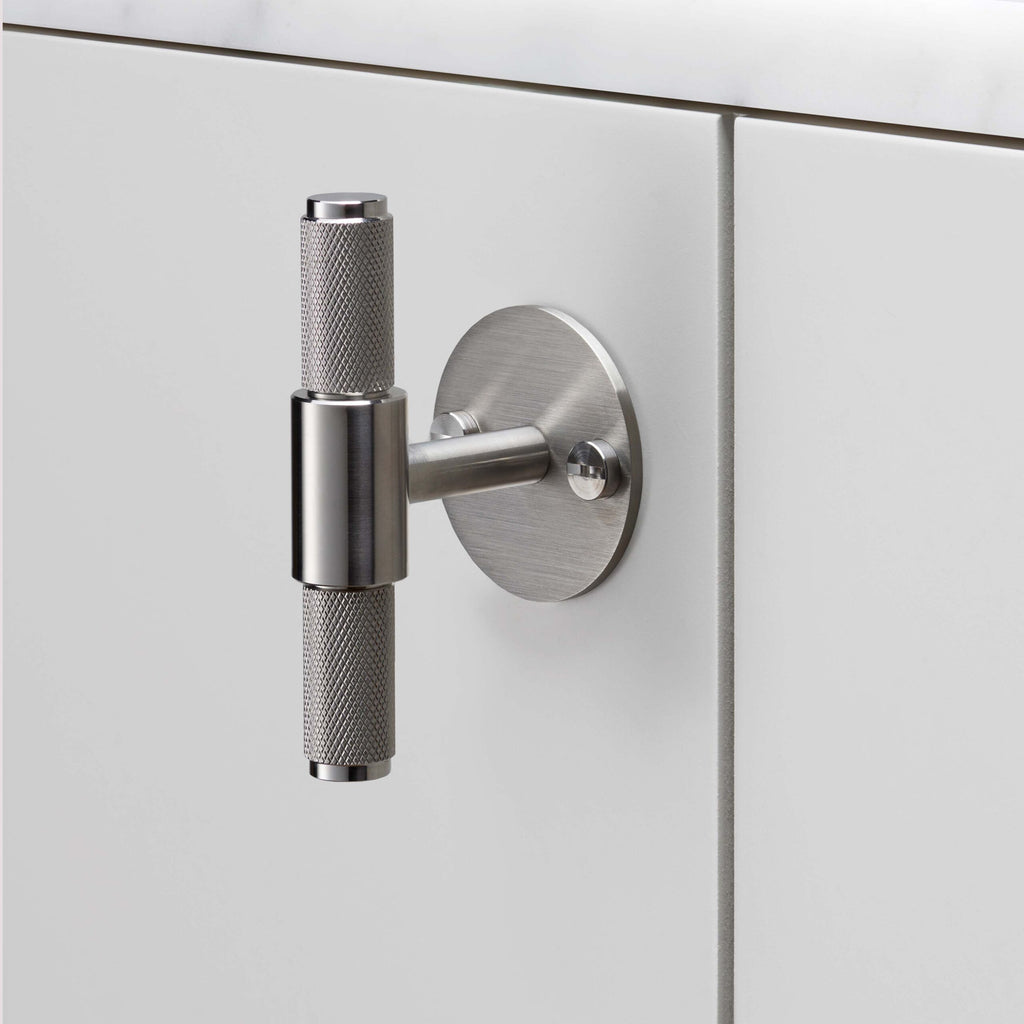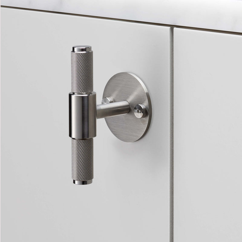 Introducing our solid brass T-bar, featuring a signature diamond-cut cross knurl pattern and a solid brass circular backplate with brass coin screws. Ideal for cabinet doors, cupboards, and kitchen units. Available in Steel, Brass, Smoked Bronze, and Black finishes.