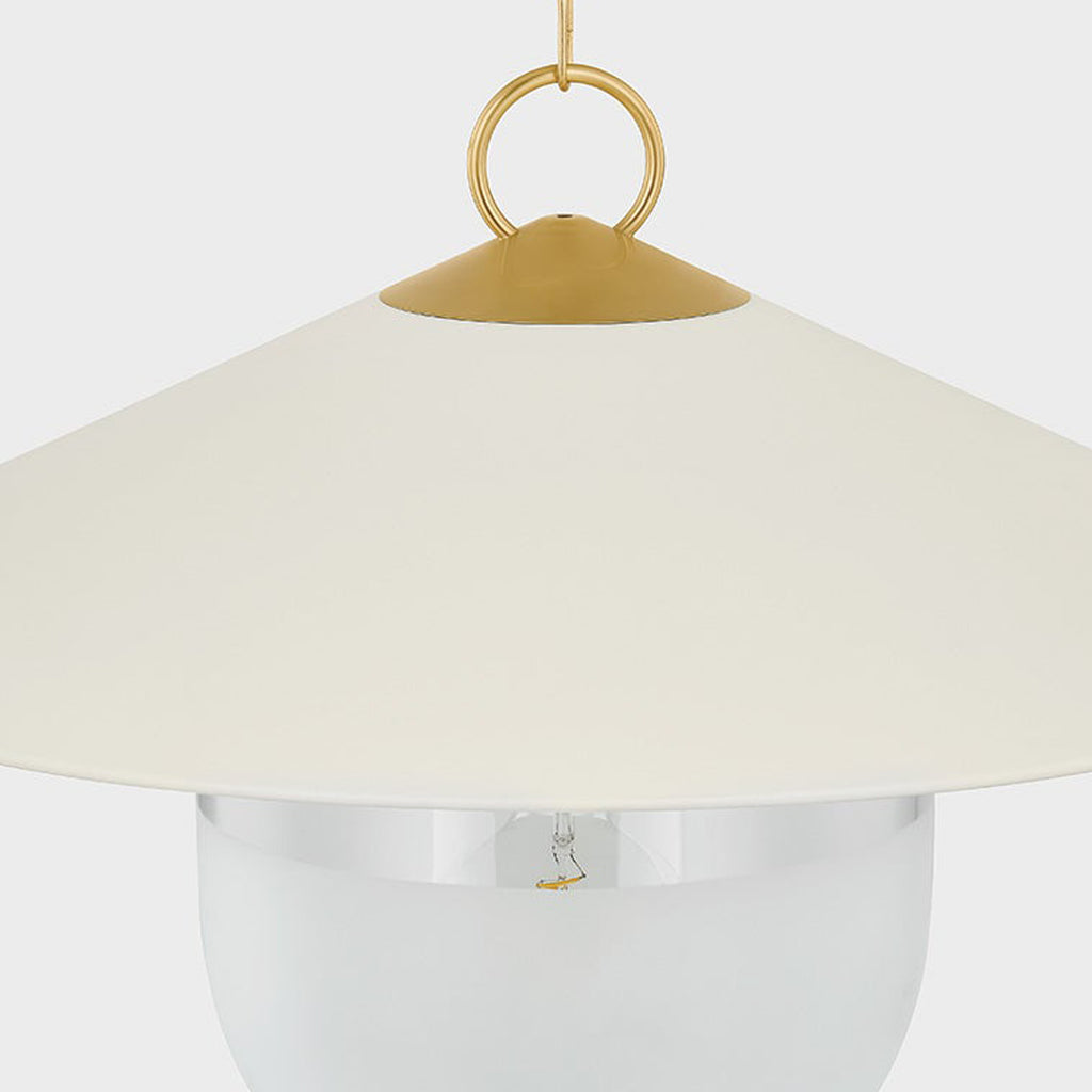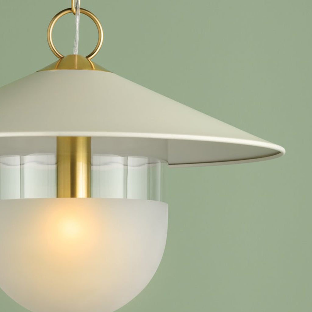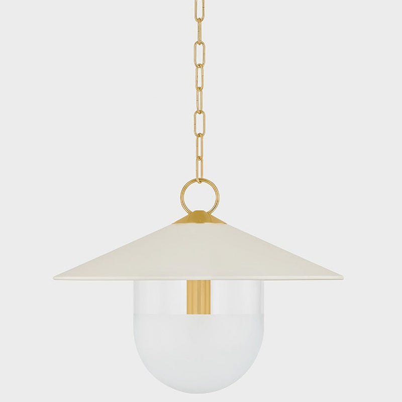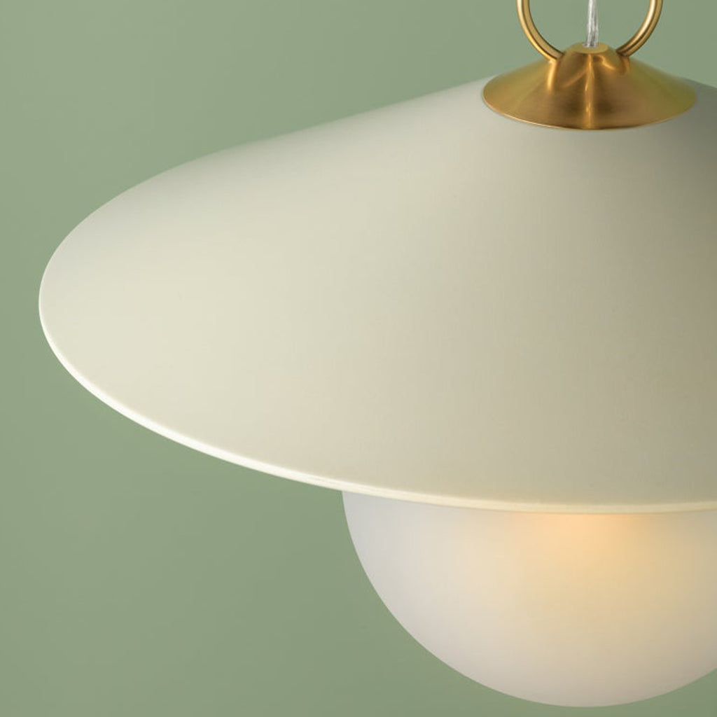 A modern update on factory lighting, Ressi combines easy geometric shapes with mixed materiality. From the clean lines of the soft cream shade to the chunky Aged Brass chain, this pendant feels fresh and approachable. The lower half of the shade is spot-etched to add a layer of diffusion, creating an atmosphere that is perfect in an entryway or above a dining table.