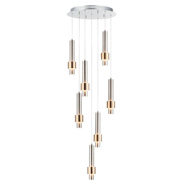 Tubular pendants finished in Satin Nickel or Matte Black in contrasting Satin Brass or Gold bands respectively. Light shines downward from the bottom of the pendant as well as a reveal of light behind the band