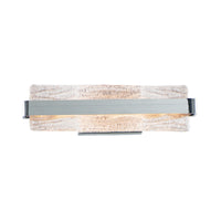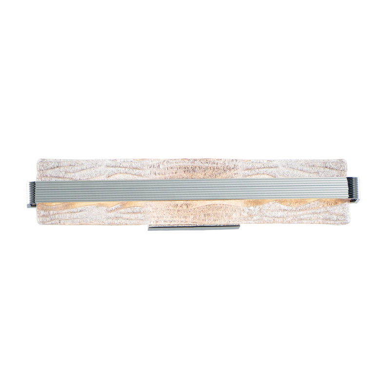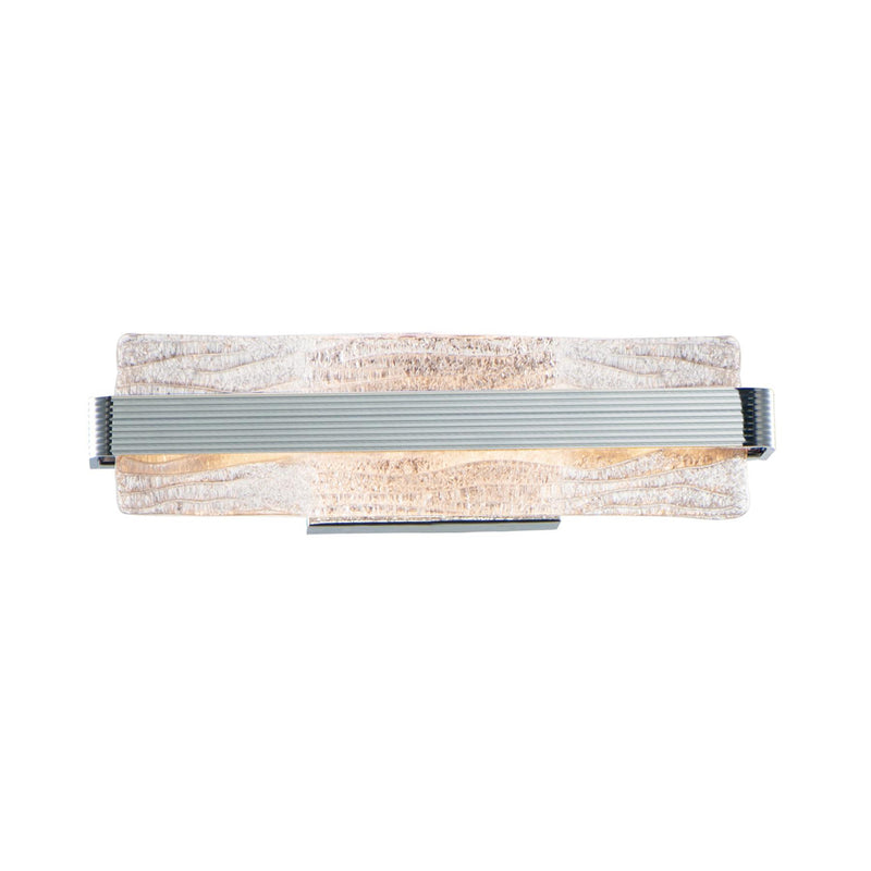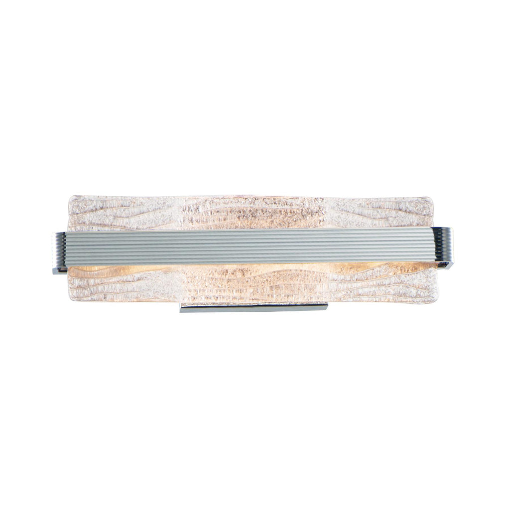A rippled horizontal bar in Polished Chrome illuminates hand-crafted artisanal Piastra-style glass. The glass's intricate texture creates an interesting light effect on the wall. Can be mounted either vertically as a wall sconce or horizontally over a mirror.
