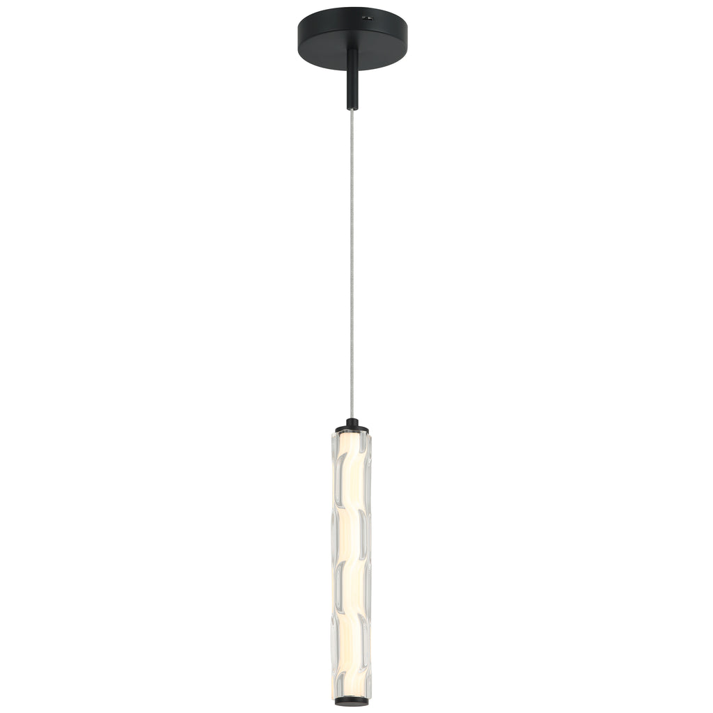 This family features a sleek, modern design with a vertically oriented, elongated cylindrical glass shade that has a wavy, textured surface. The inner 5CCT LED light diffuses through the contoured glass, giving off a soft glow that plays beautifully with the curves—adding visual interest and depth. Comes in Aged Gold Brass and Matte Black.