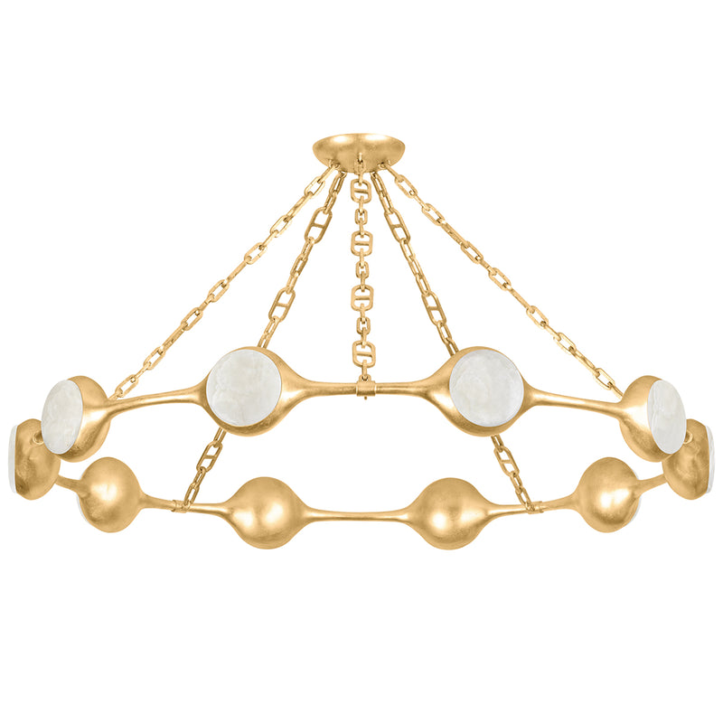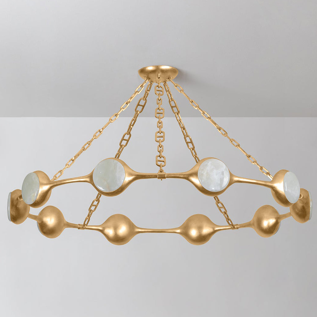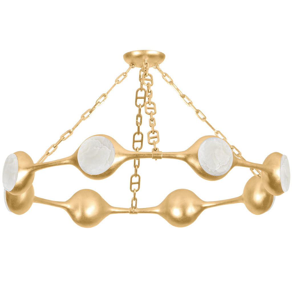 Inspired by Noz Nozawa’s stackable rings, Riviere features a classic silhouette accented by striking details and powered by energy-efficient LED. Organic, pod-shaped heads encase ice onyx discs within a bezel setting reminiscent of the way a gemstone is set into a ring. Finished in Vintage Gold Leaf, the distinctive chain suspending the chandelier adds another jewelry-like element to the design. Riviere is available as an 8 or 10-light chandelier and a single-light sconce. Part of our Noz Nozawa collection.