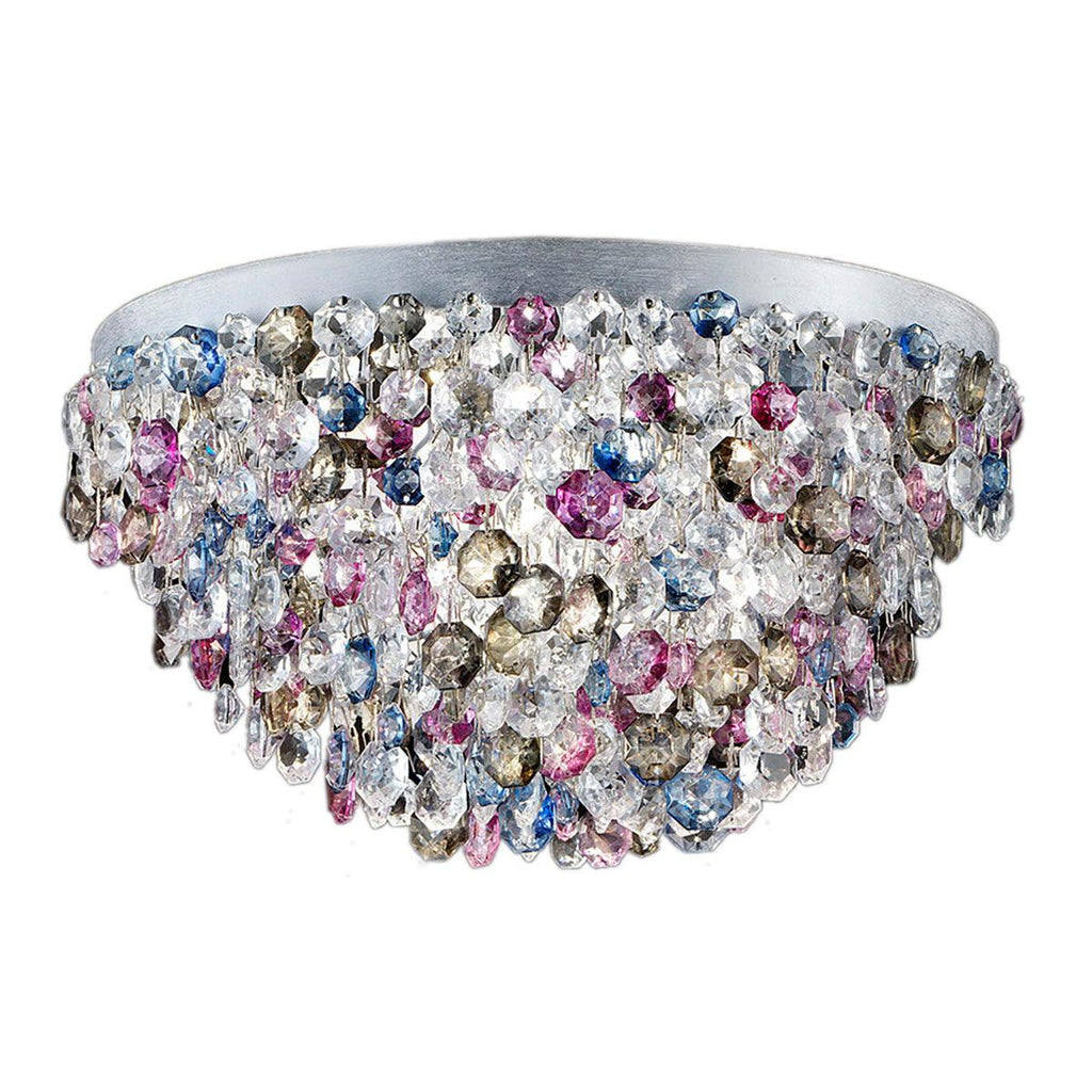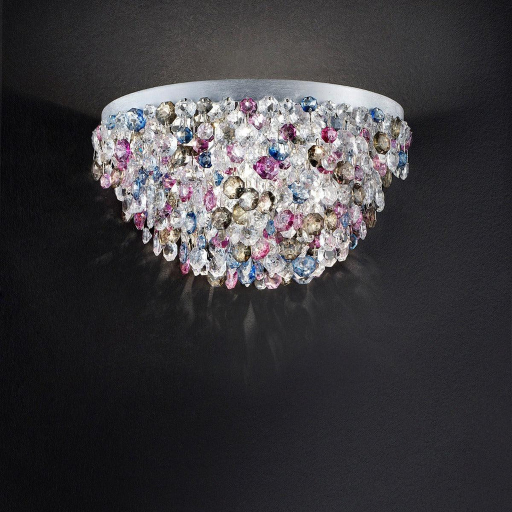 Ornamentally a masterpiece and an extravagant addition to any space, the Rosemery A1-2 Wall Sconce by Masiero will serve as a luxurious luminaire. This wall sconce features a metal frame and bejeweled with dropping and colorful glass droplets. The light source is concealed by the droplets and when illuminated casts light through those lovely droplets, creating an accented and diffused light. This wall sconce’s frame is finished in ivory/pale gold and glossy white/silver. It is perfect for use in bedrooms, hallways, living room and dining room.