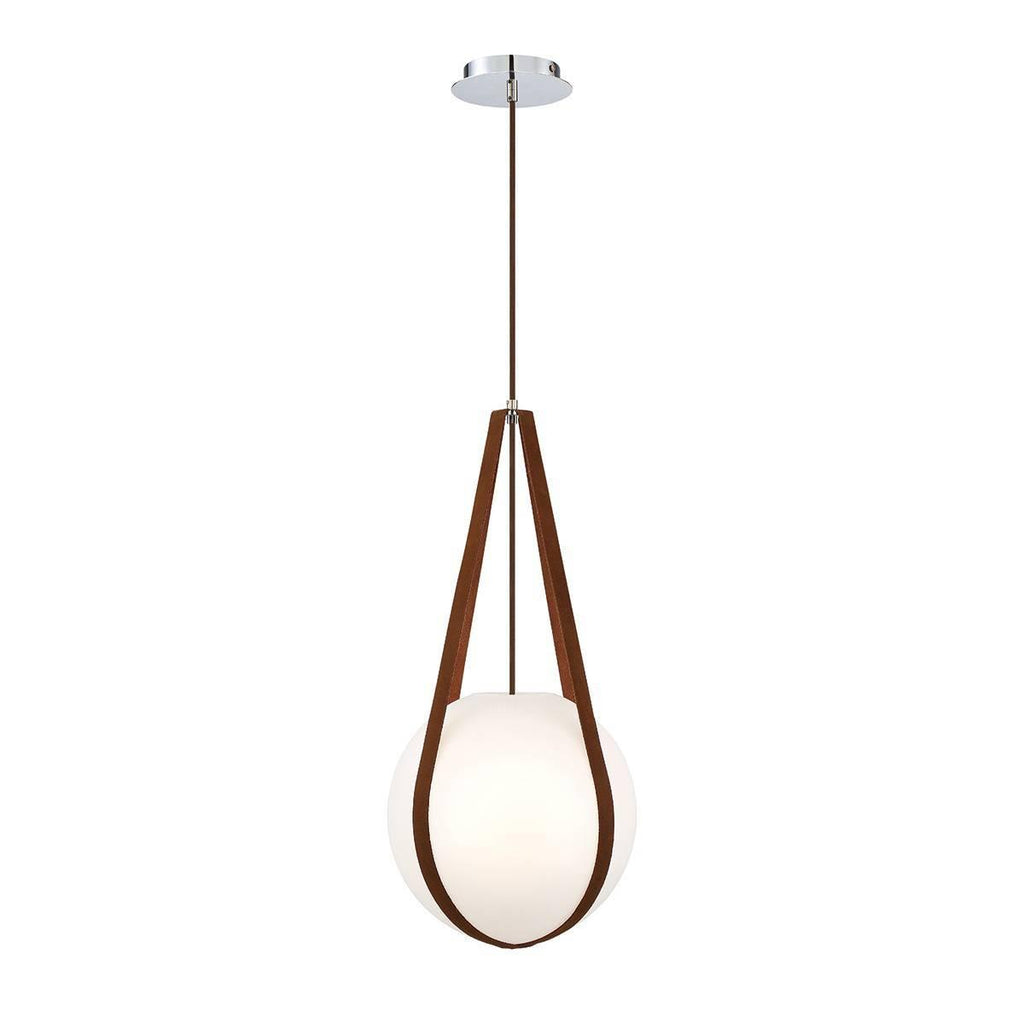 Brighten up your kitchen, hallway, bedroom, bathroom or office with the Rosemount 1-Light Pendant by Eurofase. It features a glass orb pendant with pleated glass design that looks like a spherical crystal ball that is firmly held by an arrangement of leather strappings around it. The long 72" support wire provides an extended E26 light source that dips inside the glass pendant. The glass orb sphere is chrome finished that complement the brown leather straps.