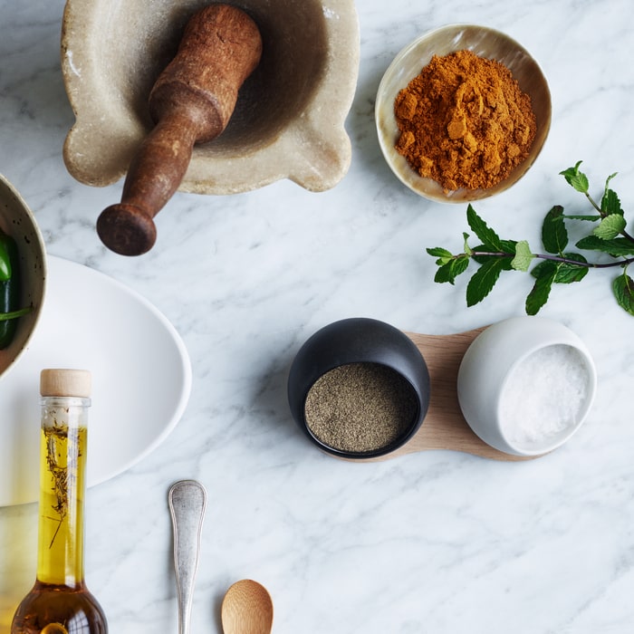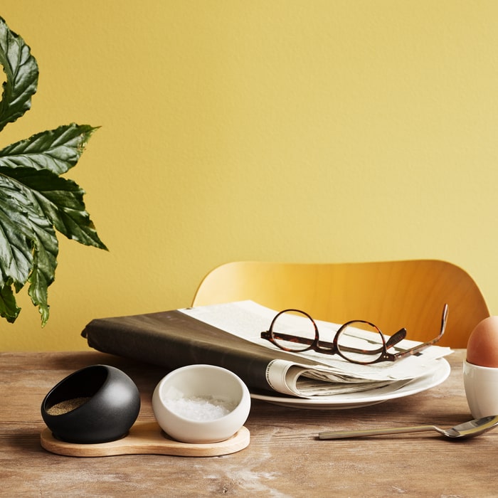 Get all set for dinner with these superb Rosendahl Salt and Pepper cellars. Both cellars are made of porcelain and have been glazed white and black respectively, with a glossy interior and a matte exterior. The two small cellars are accompanied by a holder made of untreated European oak. The simple design with the rounded shapes and the combination of porcelain and untreated wood gives the set a simple, Scandinavian look that fits in well with contemporary home interior trends. Place the set on the dining table and let your dinner guests help themselves to the aromatic seasonings.