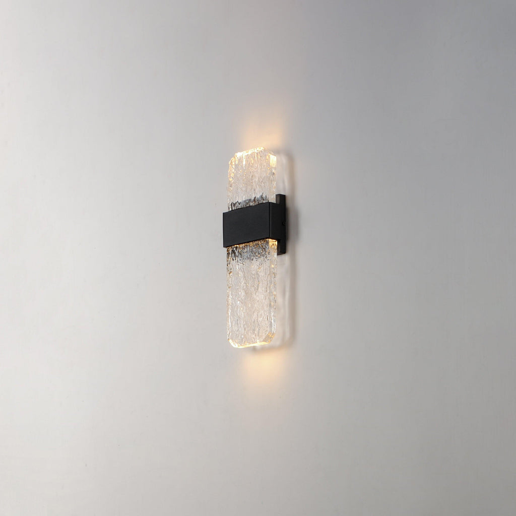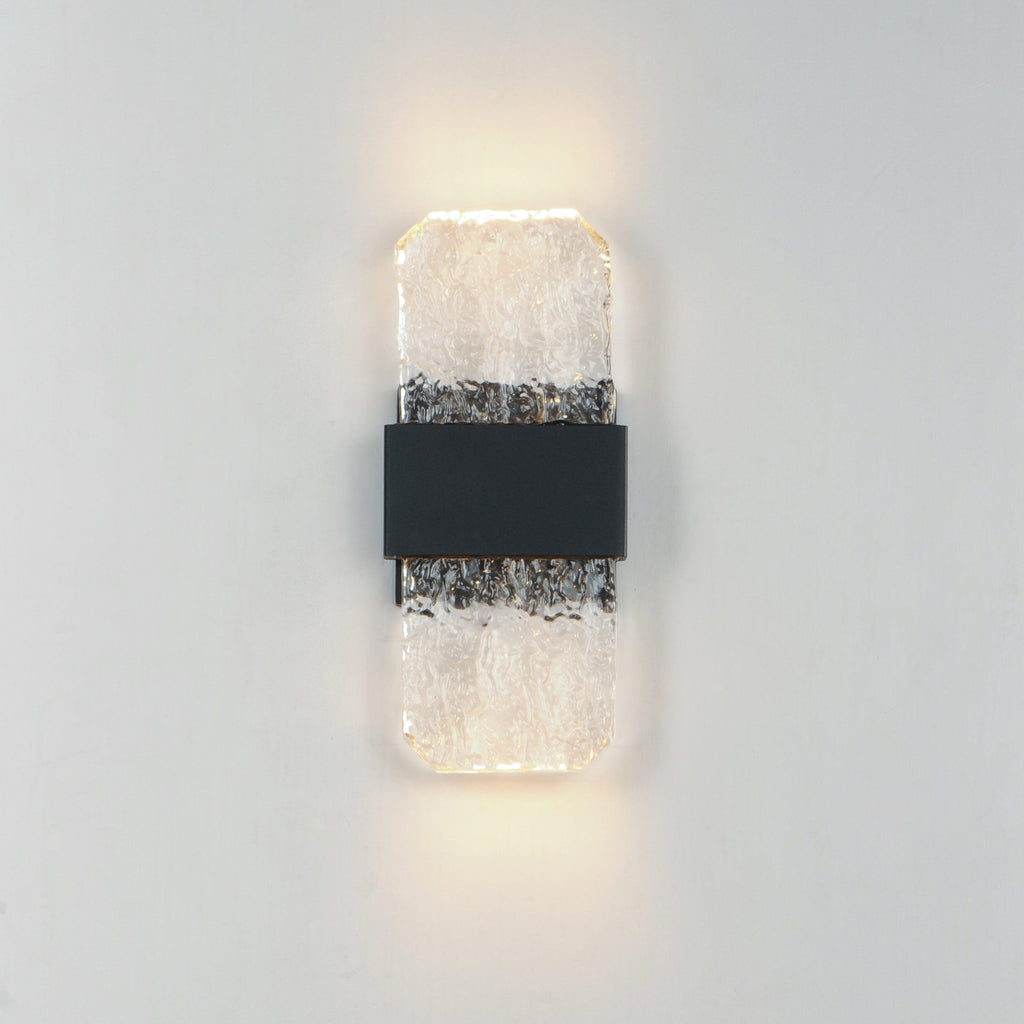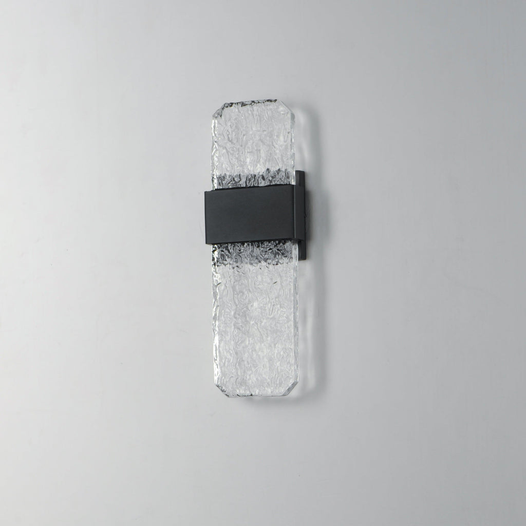 Artisanal cast glass slabs are supported by a Die Cast Aluminum bracket finished in an outdoor rated Black powder coat. Emphasizing the unique beauty of the glasses' imperfect contours, the sconces accentuate these features with concealed LED lighting. Available in 3 size configurations, the sconces provide adequate lighting and showcase the craftsmanship of the artistic glass.