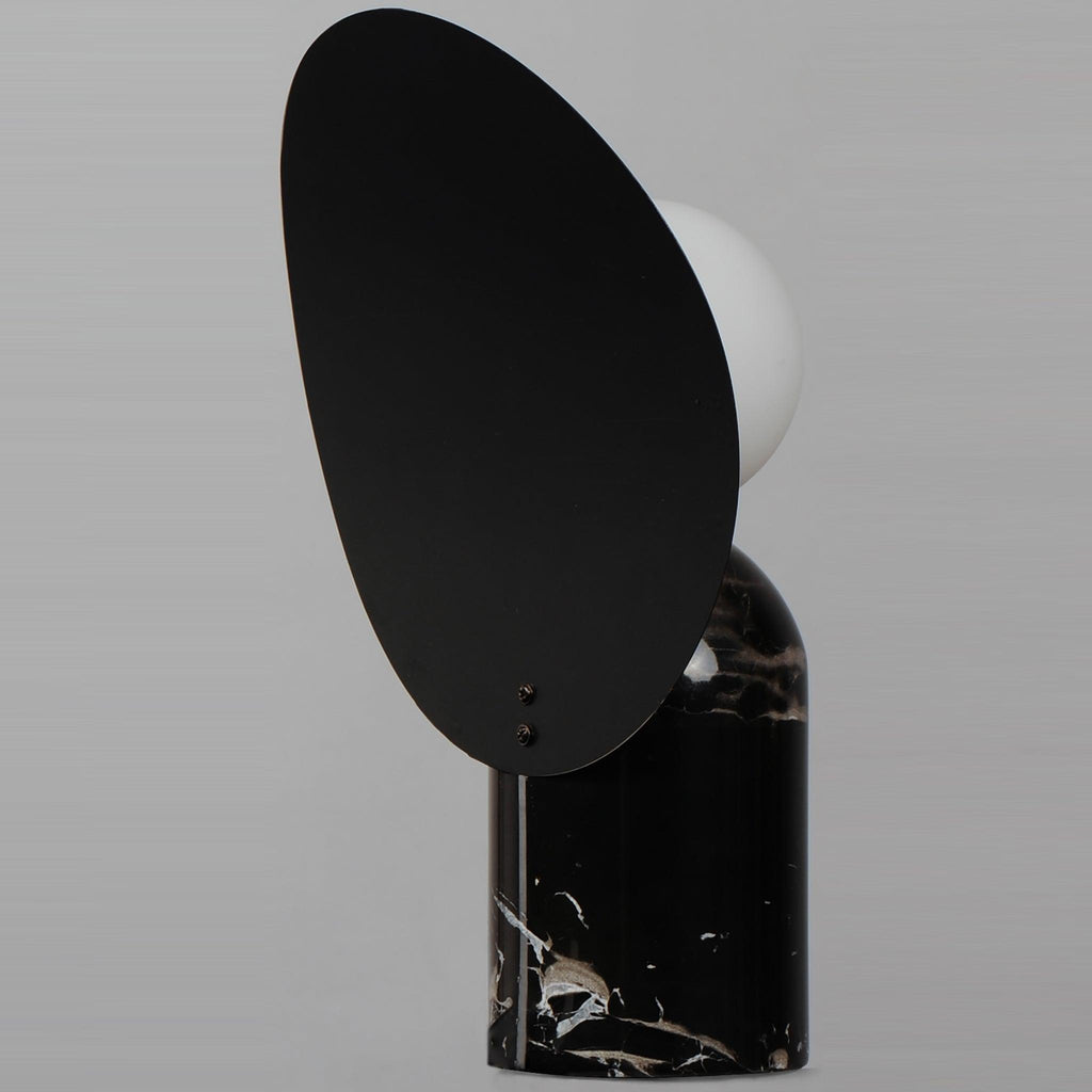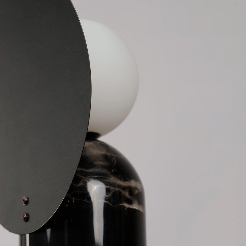 A bold dish of French Gold reflects the glow of Satin White Opal White glass shades that softly diffuse LED lamps included. The globe shade rests on a solid mass of exquisitely veined Black marble. The combination offers a delightful combination of elements with a restrained, yet sophisticated design for a useful accent lamp.