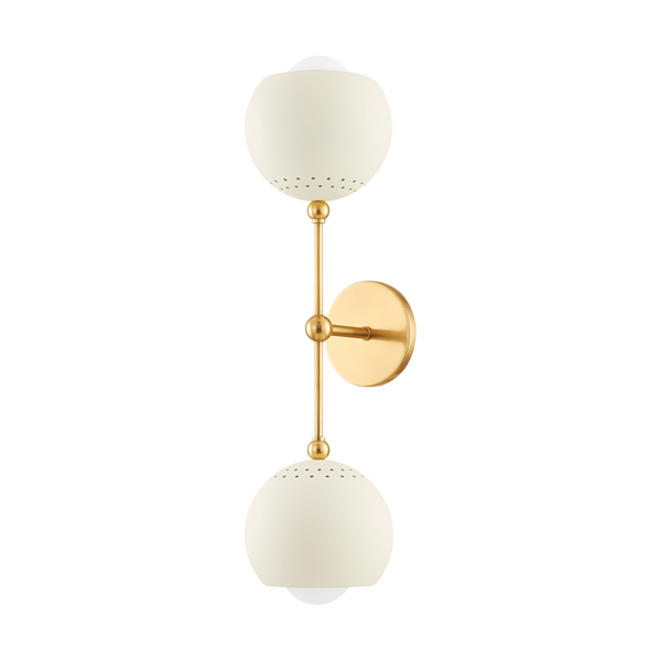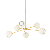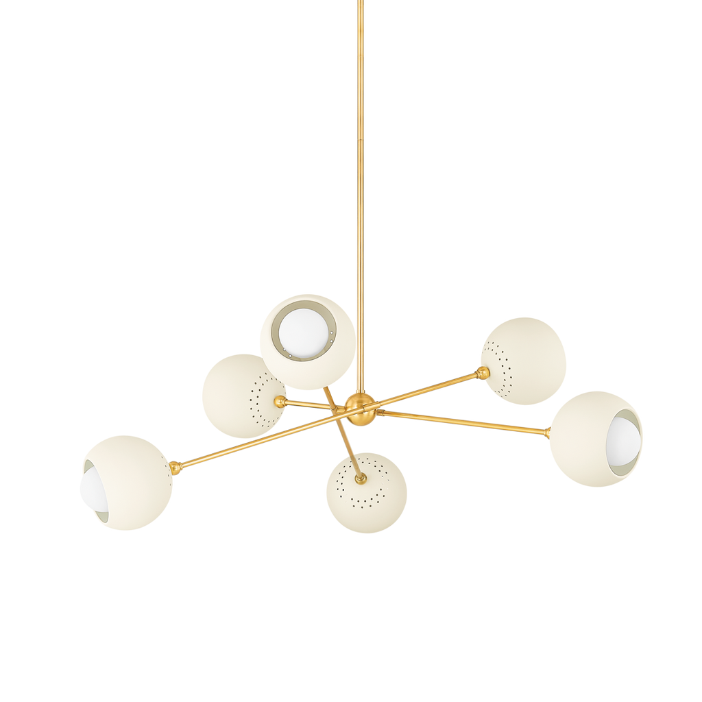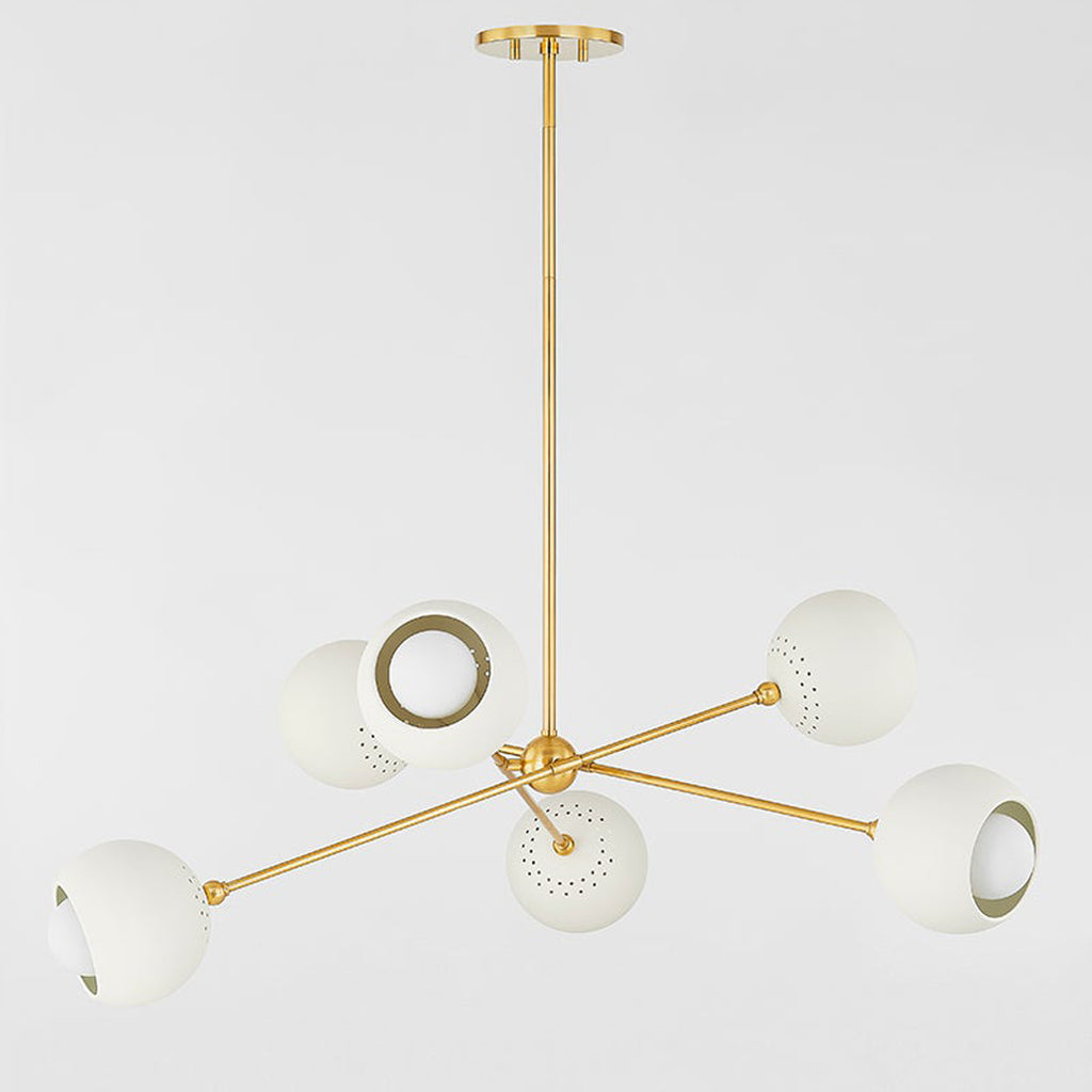 An imaginative twist on a mid-century modern design, Saylor has a modernized atomic look with large orb shades, an Aged Brass framework, and subtle vintage details. The swivel arms of this chandelier can be configured at any angle, providing control over the direction of light. Perforation details add a pop of interest to the shades. Saylor is available as a 6 or 8-light chandelier and a 2-light sconce.