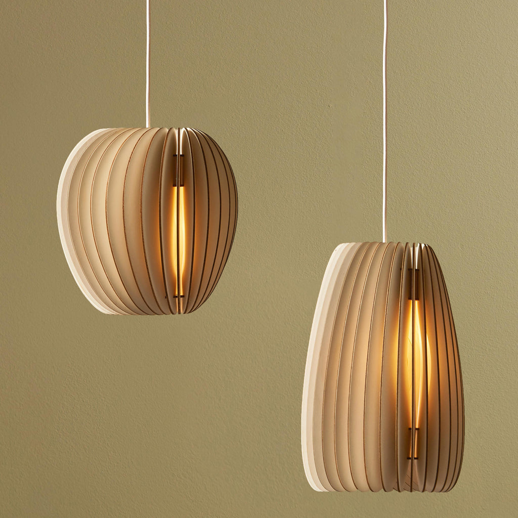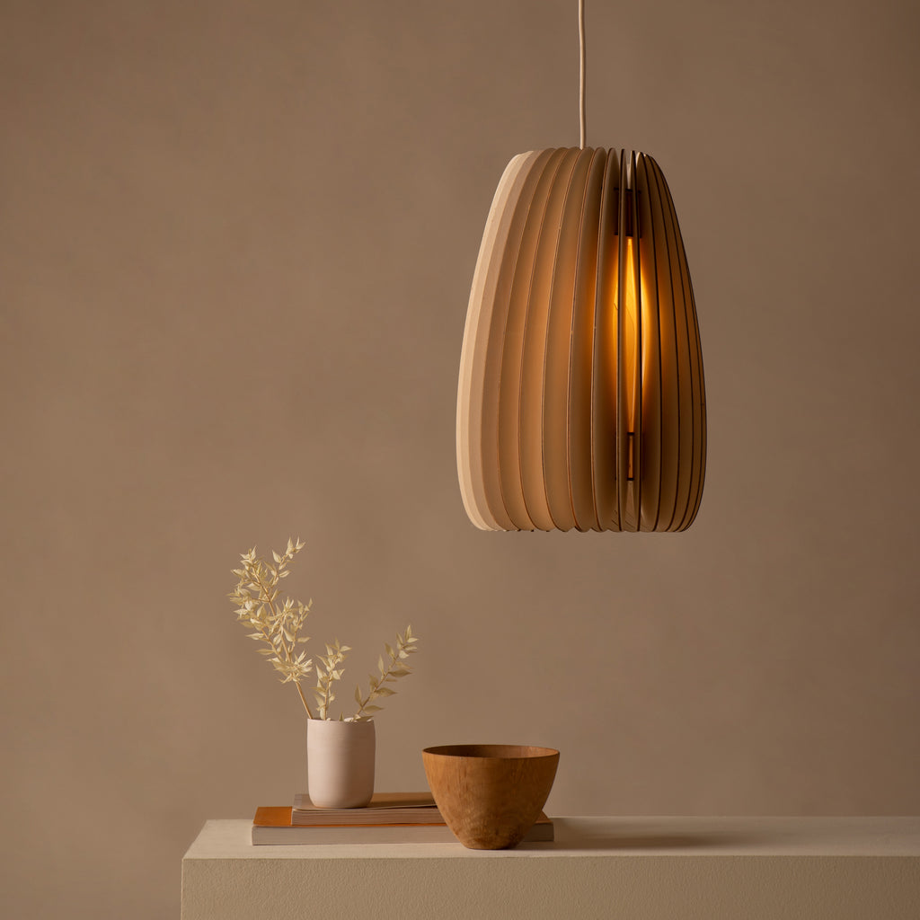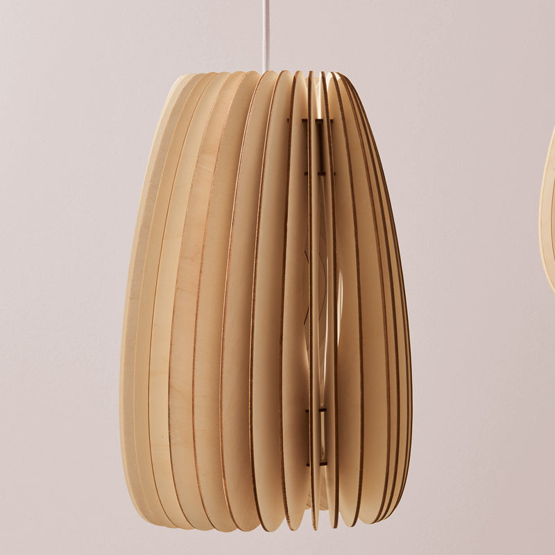 Pirum, Secundum and Volum: Three lamps that stand for naturally warm light. All three lights are constructed by the same principles and yet every lamp stands out with its own special shape and character. The intricate structure of the lamp allows the light to subtly shine through the thin wooden slats and cast a glare-free light which creates a natural ambience. The lamp is hand manufactured of untreated, sustainable wood in our own studio in Lübeck, Germany.