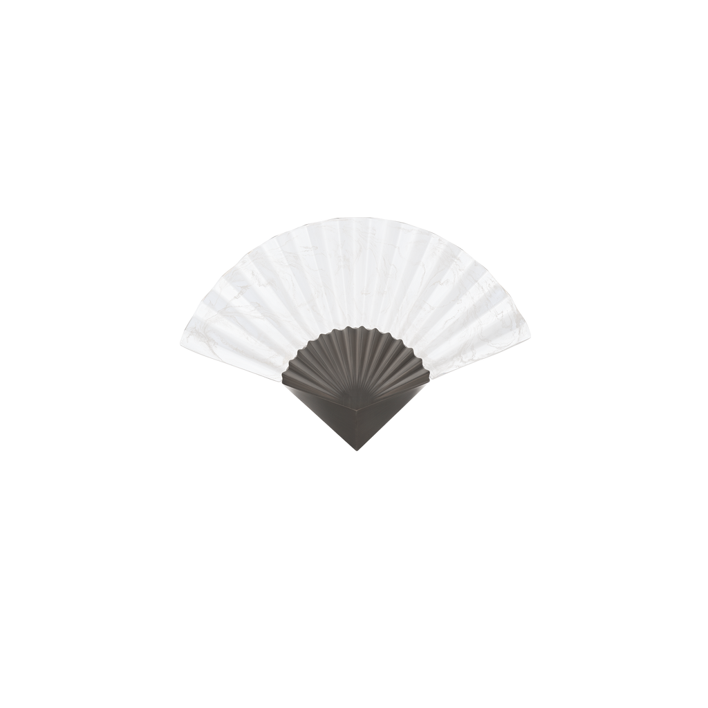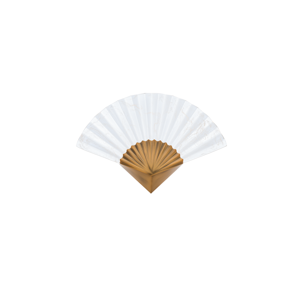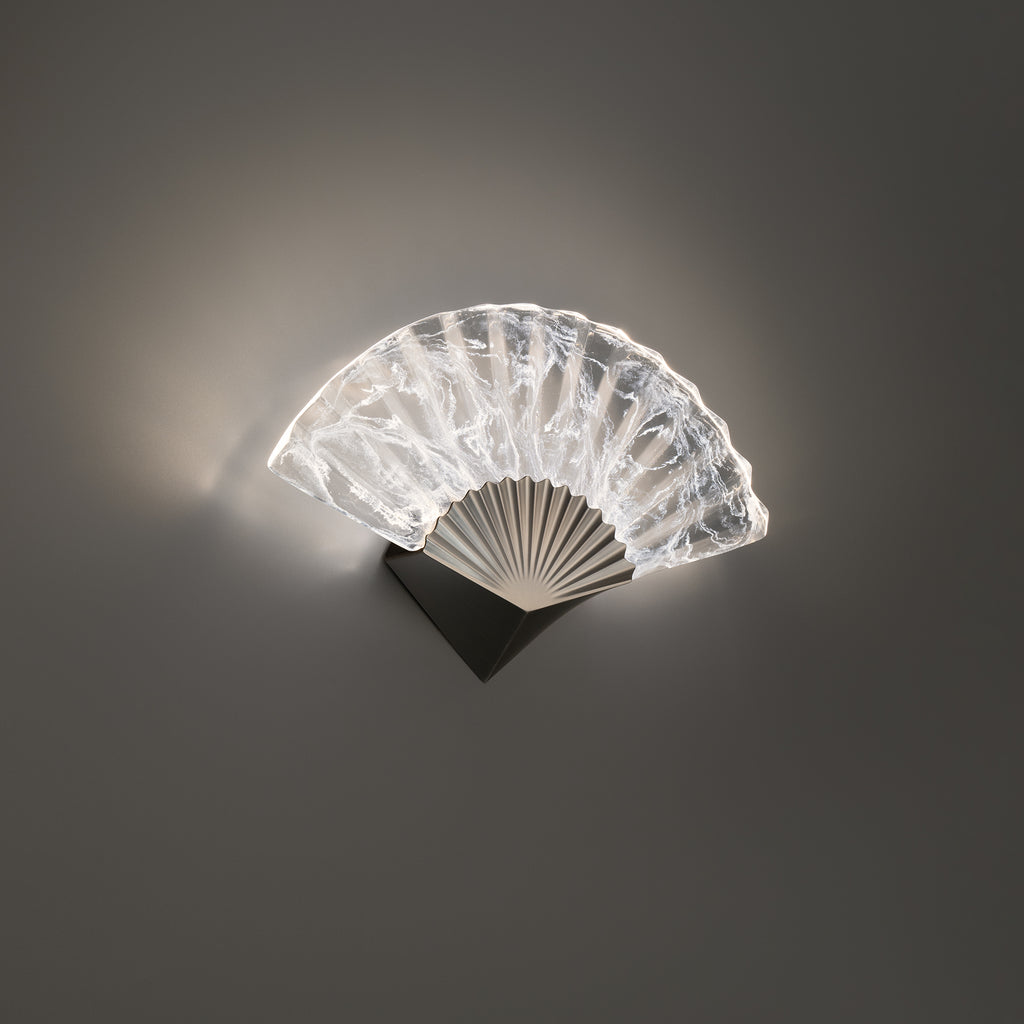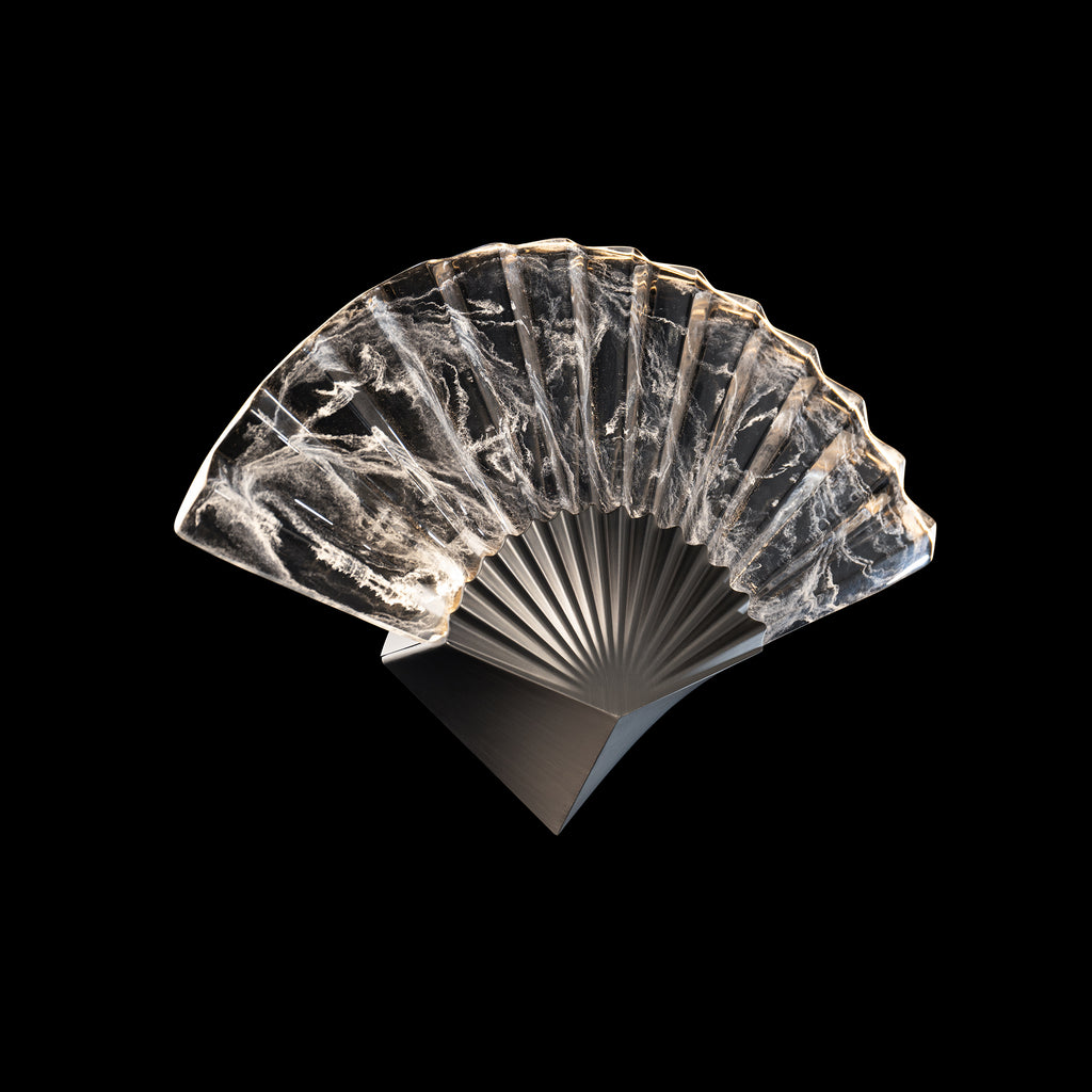 Opulent origami. Within a hazy cloudy acrylic patterned shade, carefully crafted folds serve as prismatic marvels, gracefully redirecting the integrated LEDs' radiance.
