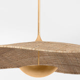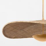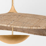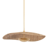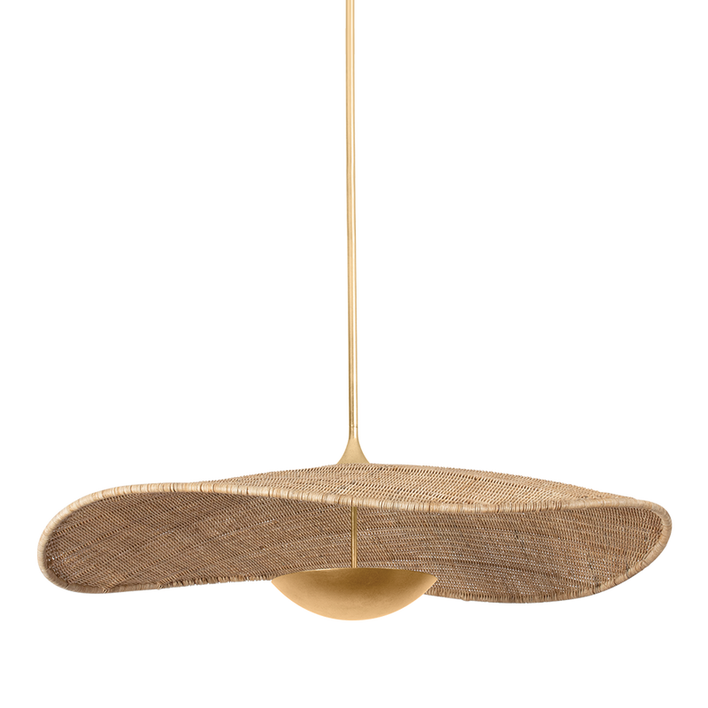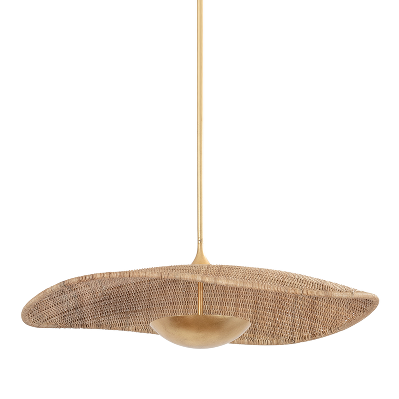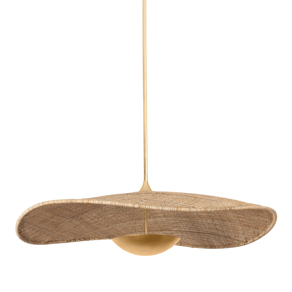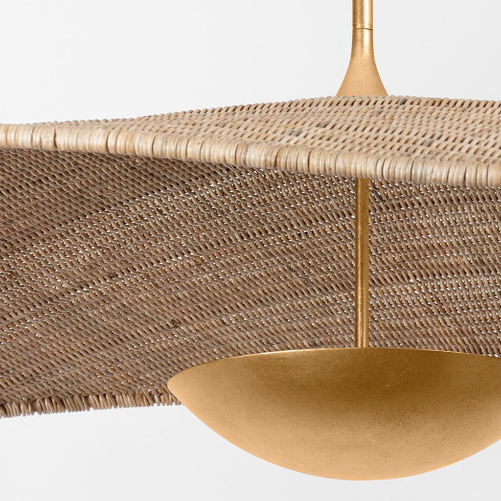 A dialogue between form and material, this nature-inspired design undulates with charm. The interplay of woven rattan and fluid metalwork creates a dynamic and airy suspension overhead. Accented by a warm Vintage Gold Leaf finish, the detailed craftwork and textural finish present a distinctive, organic look. Illuminated by LED, Shiloh is available in two pendant sizes.