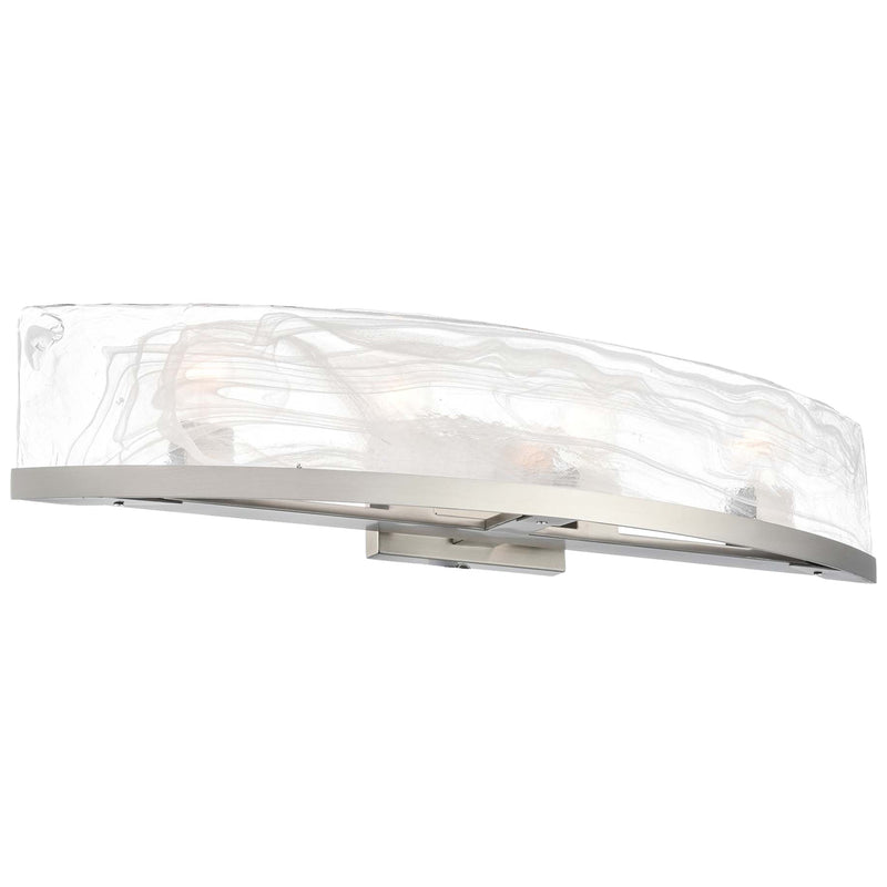 This stunning 3/4 bathroom sconce exudes timeless elegance, blending a brushed nickel frame with the ethereal beauty of wispy white Murano-style glass panels. Its cylindrical silhouette radiates sophistication, creating a soft, ambient glow perfect for intimate spaces. The craftsmanship of the Skye collection by designer Kevin Kraemer is evident in the graceful harmony between its materials and design. This piece serves as both a functional light source and a work of art, elevating any room with its luxurious charm.