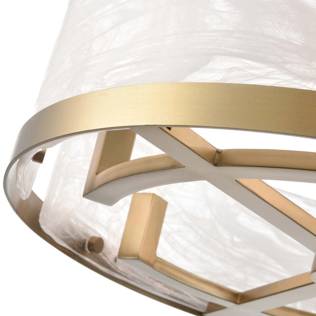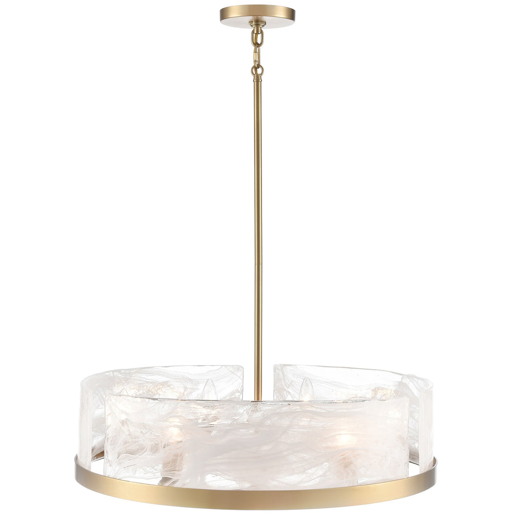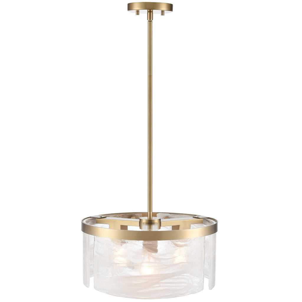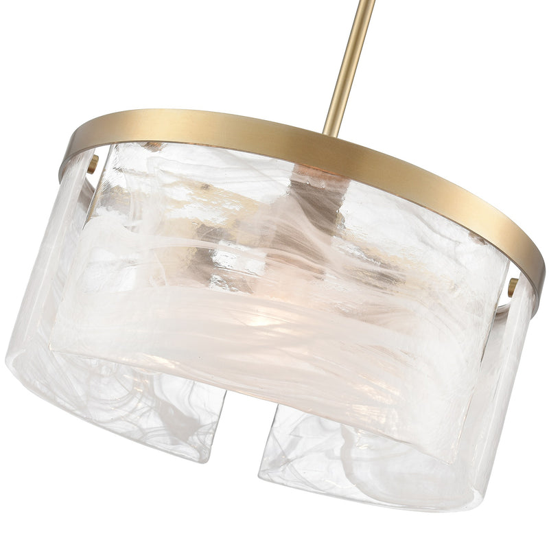 This stunning pendant light exudes timeless elegance, blending a brushed brass frame with the ethereal beauty of wispy white Murano-style glass panels. Its cylindrical silhouette radiates sophistication, creating a soft, ambient glow perfect for intimate spaces. The craftsmanship of the Skye collection by designer Kevin Kraemer is evident in the graceful harmony between its materials and design. This piece serves as both a functional light source and a work of art, elevating any room with its luxurious charm. (This model can be used as a pendant or shortened to be a semi-flushmount for close to ceiling needs).