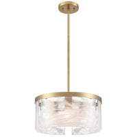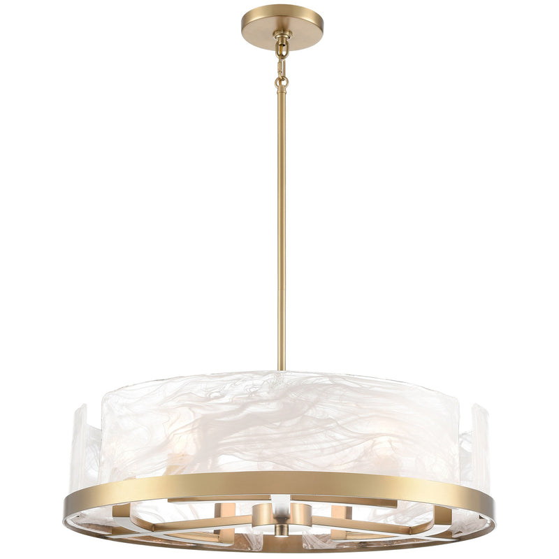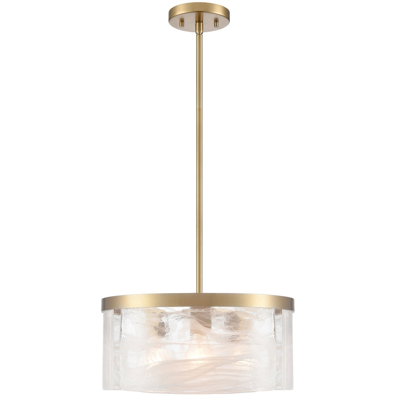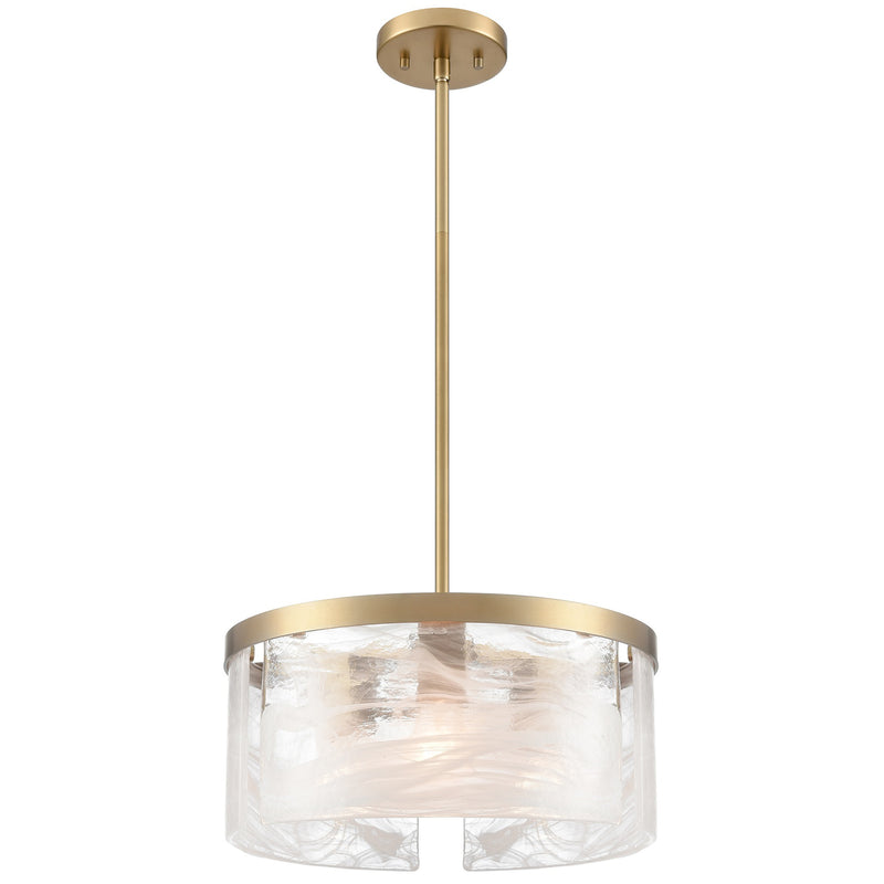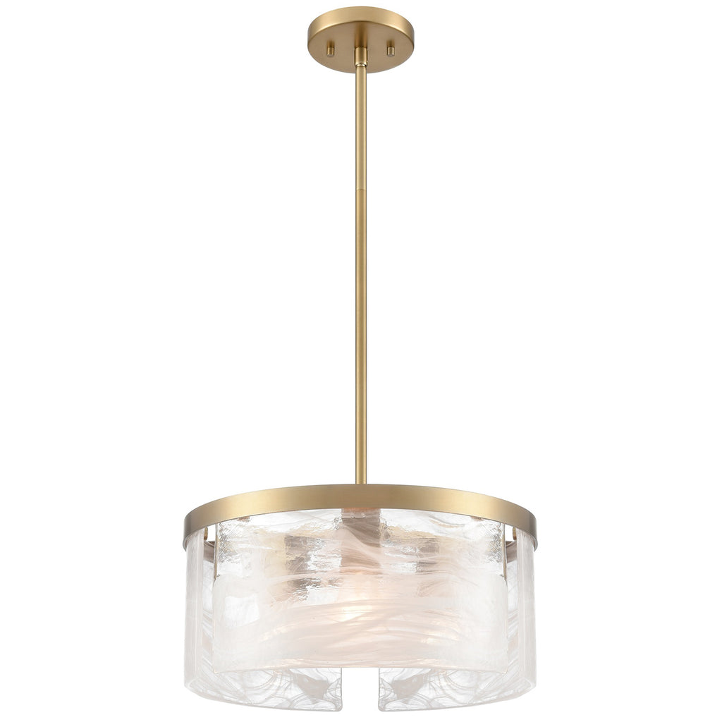 This stunning pendant light exudes timeless elegance, blending a brushed brass frame with the ethereal beauty of wispy white Murano-style glass panels. Its cylindrical silhouette radiates sophistication, creating a soft, ambient glow perfect for intimate spaces. The craftsmanship of the Skye collection by designer Kevin Kraemer is evident in the graceful harmony between its materials and design. This piece serves as both a functional light source and a work of art, elevating any room with its luxurious charm. (This model can be used as a pendant or shortened to be a semi-flushmount for close to ceiling needs).
