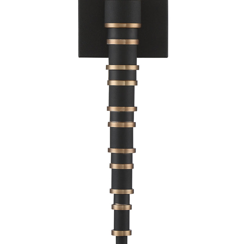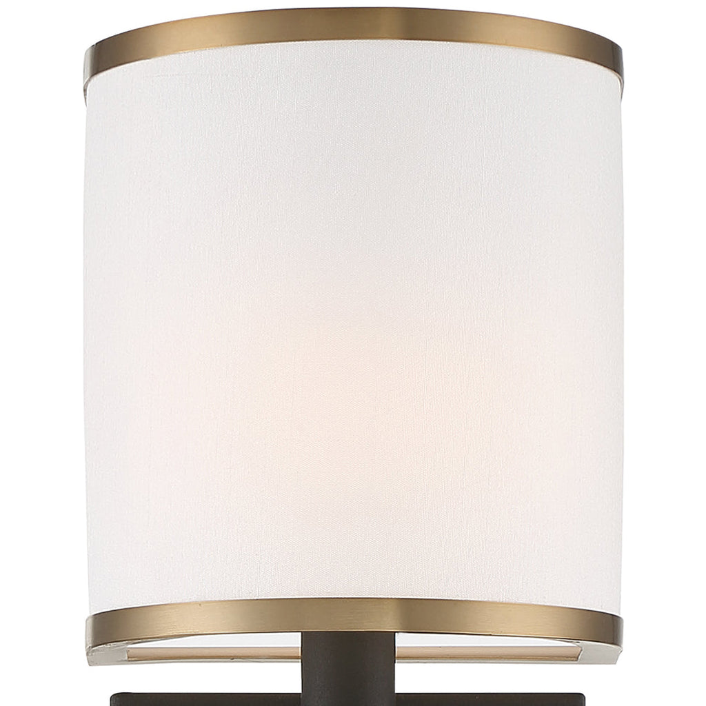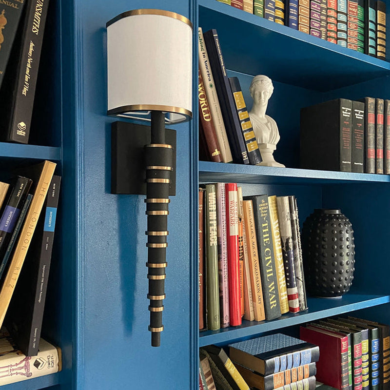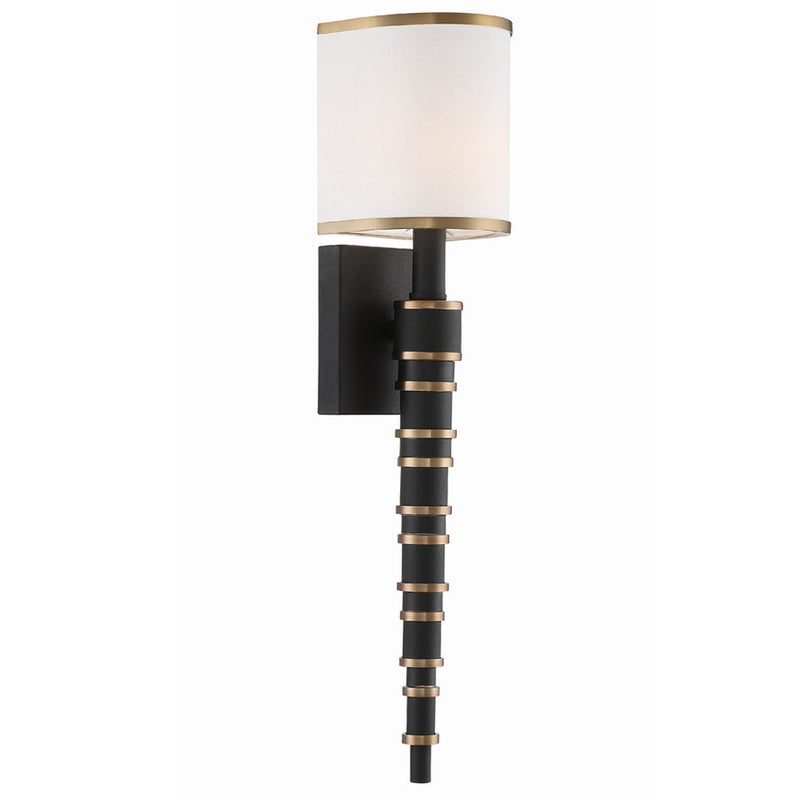Add elegance and sophistication to a room with the Sloane vibrant gold and black forged metal wall sconce. It's elongated tapered arm, and cylindrical white silk shade is an effortless way to add visual interest to your wall.