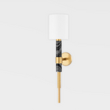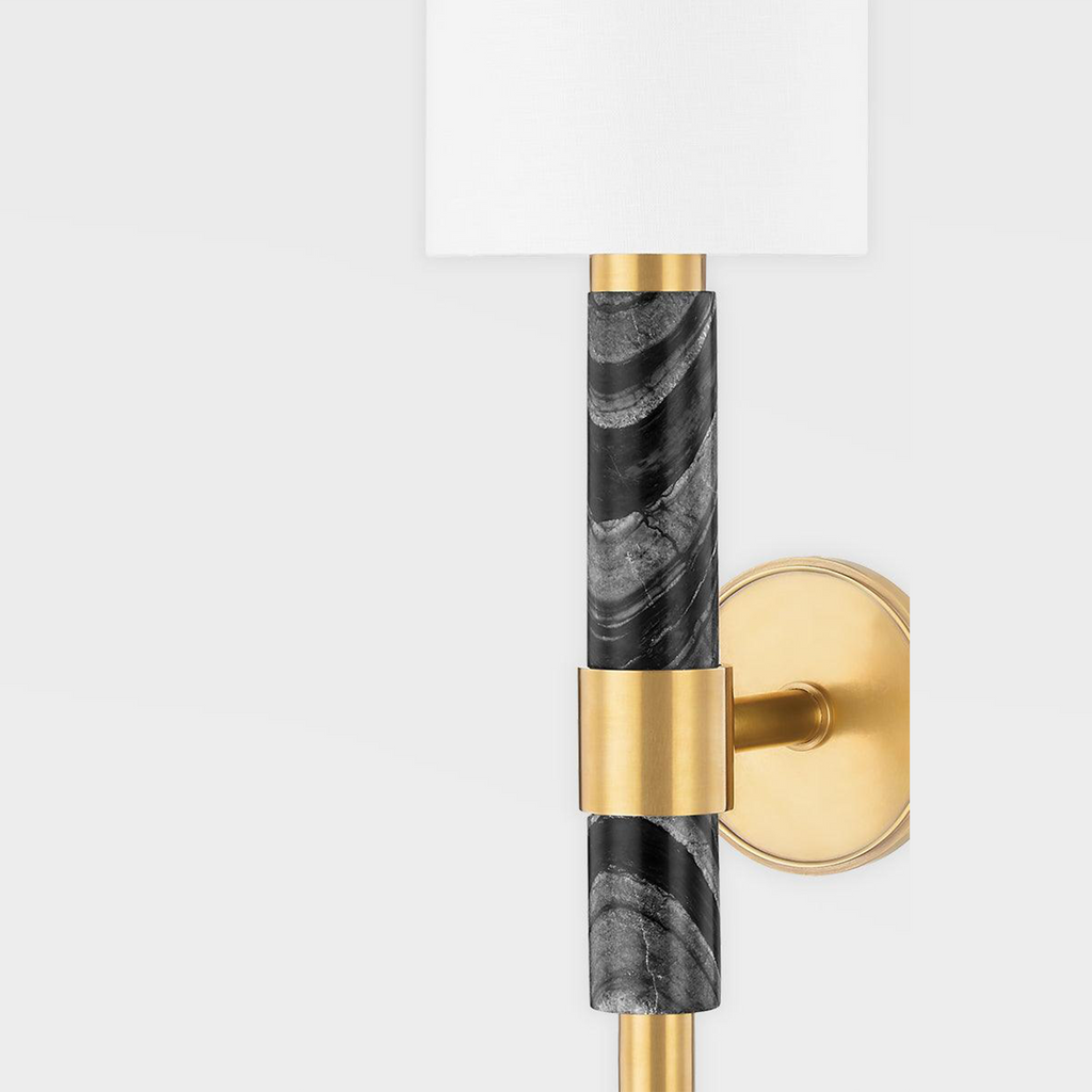 Sleek and stately, Solstice adds a polished presence to any space. A backplate and band in vintage brass hold a lofty arm of Nero Madera or Arabescato marble flanked by more vintage brass metalwork. A white linen drum shade tops off this sophisticated sconce.