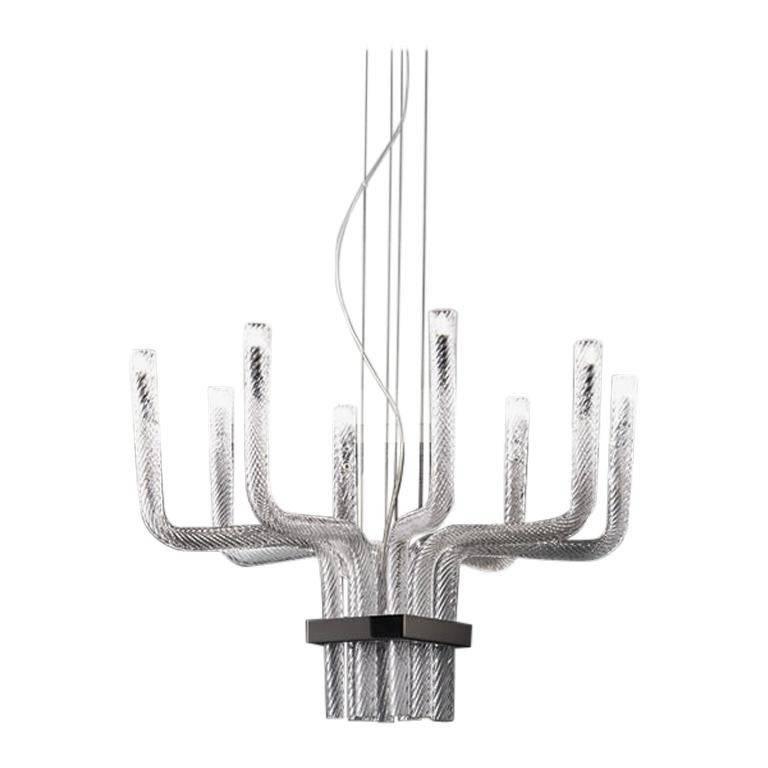 The Stardust SP Q Chandelier brings together the ancient glass products and latest techniques. The eight classic Murano glass rods are treated with the rigadin technique to form a rope-like, twisted pattern. A square metallic box in black nickel finish accommodates the glass arms and provides a clean look to the fixture by concealing the cables. It uses 8 G9 light sources to cast a soothing illumination in any living room and dining areas.