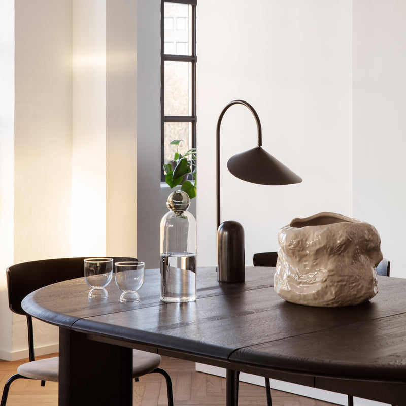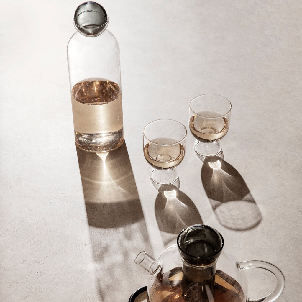 Our Still series of glass tableware looks to traditional teamaking rituals, simplicity and balance to create everyday objects rooted in beauty and function. The sphere-shaped coloured glass stopper sits like a bubble of air on top of the mouth-blown carafe, designed to elegantly hold water, juice or other liquids. Made for everyday use, pair it with the matching glasses to create a stylish set.