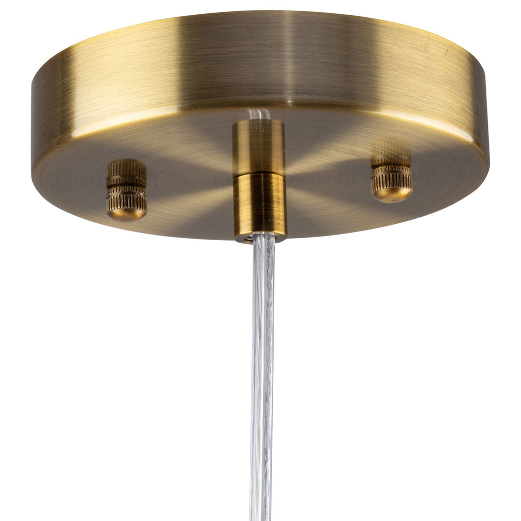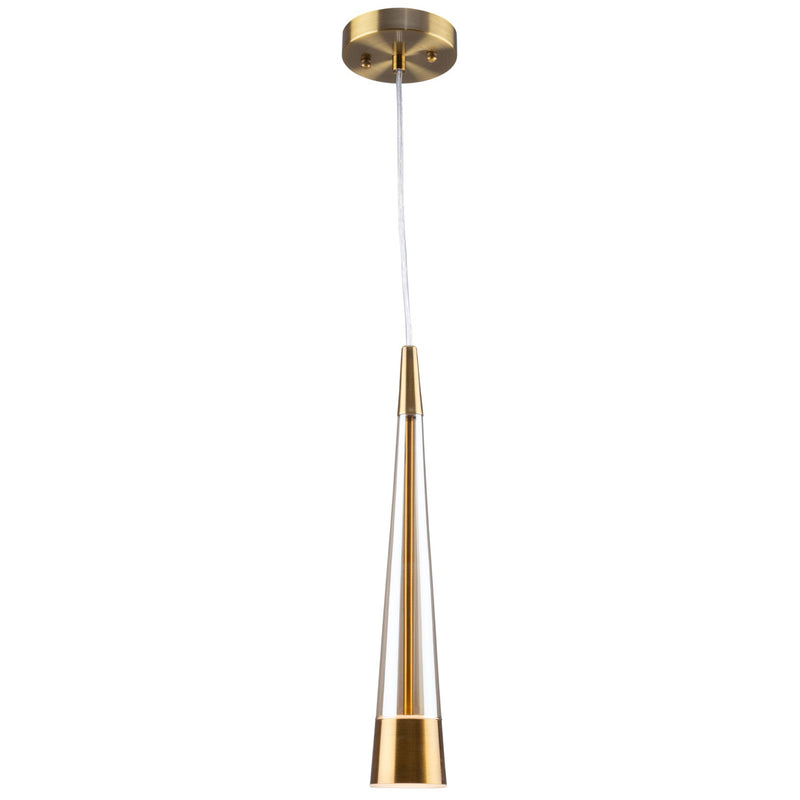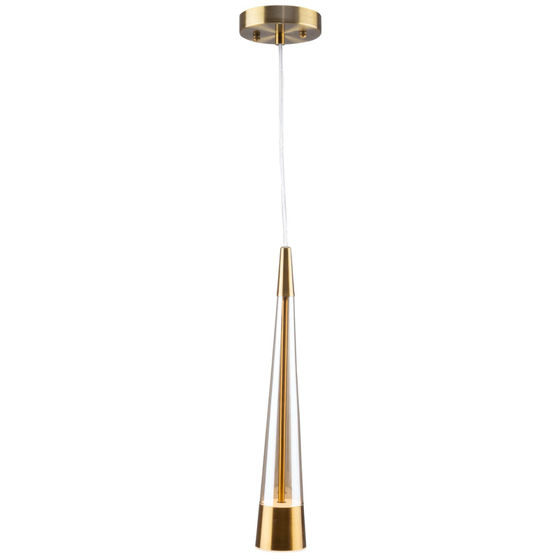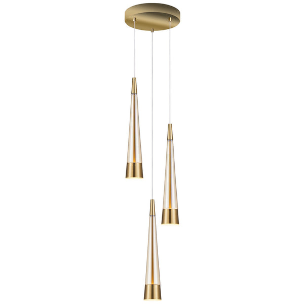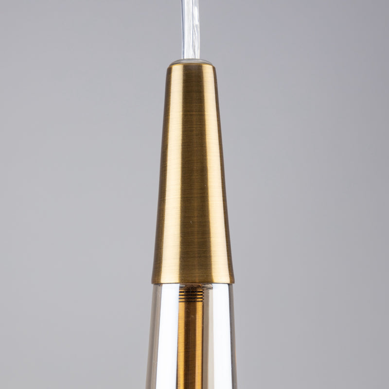 The Sunnyvale collection boasts a distinctive cone-shaped design adorned with metalwork on both the top and bottom, enveloping a captivating tea stain tinted center glass complimented with brushed brass framing. The pendant's exquisite craftsmanship and attention to detail result in a contemporary yet elegant aesthetic, making it a standout piece in any interior. With LED illumination seamlessly integrated throughout the glassware, the Sunnyvale collection not only delivers striking visual appeal but also provides efficient and ambient lighting. Single pendant shown. (easily height adjustable).