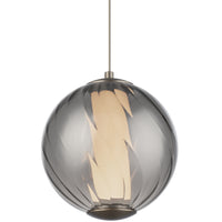 A glass globe adorned with dynamic swirling contours combines color temperature selectable LED light and high style in the luxe Swirly pendant. The pendant’s smoked glass orb is suspended from a simple cord and is capped with metal finished in aged brass or black on either end for an elegant touch. Swirly is available in 7 and 11-inch sizes.