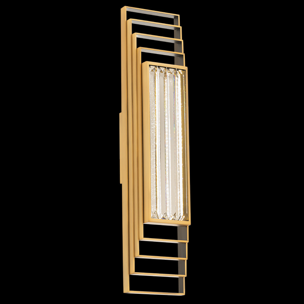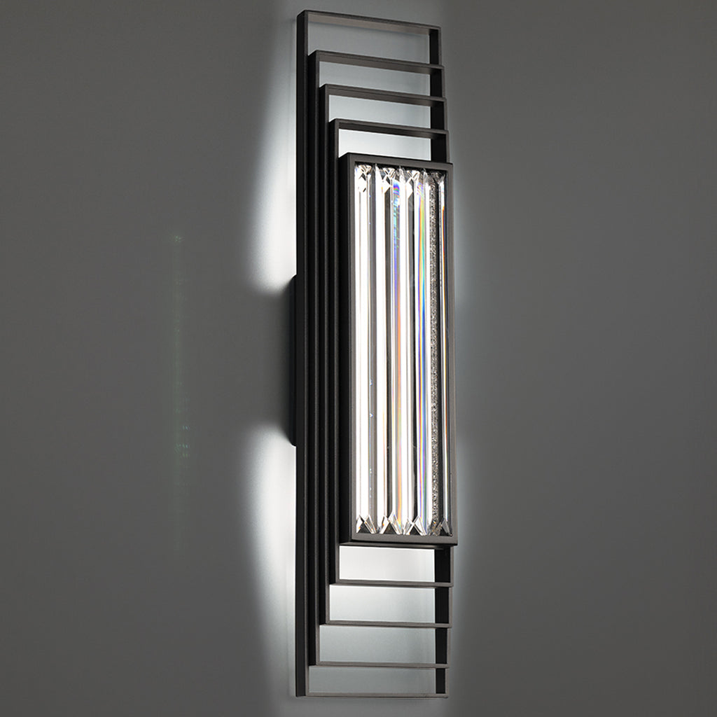 Clean geometry is lined with stepped Optic Crystal panels that transform when illuminated, creating intricate highlights and reflected color from its diffused edge-lit design onto the crisp background of walls.