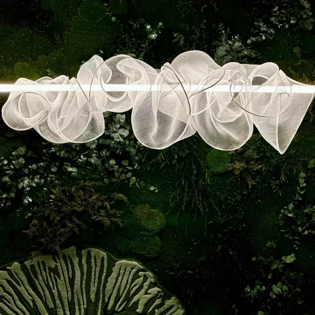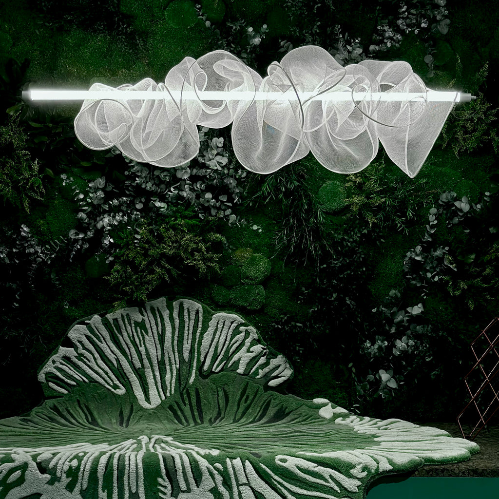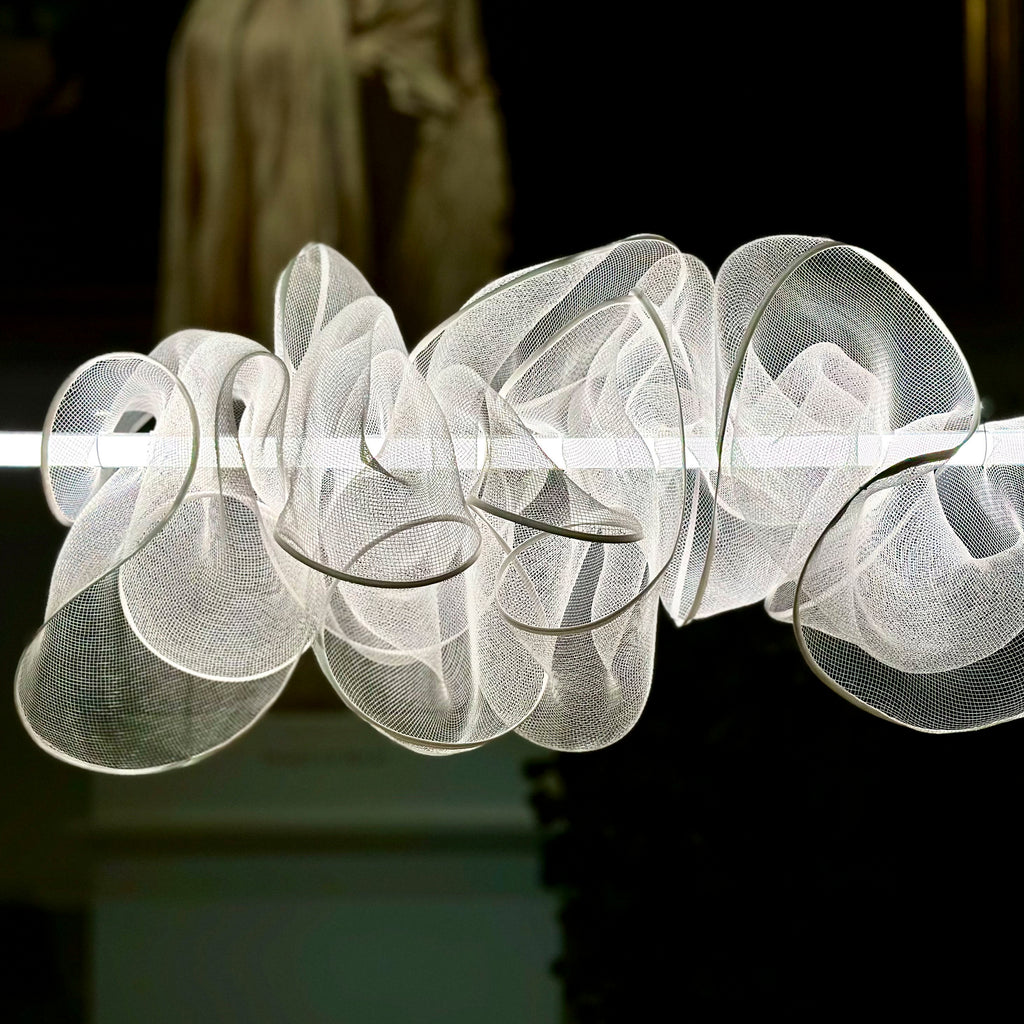 This dreamlike light pays homage to the movement of clouds that appear, re-form and disappear. It echoes fantasy and speaks of the dexterity with which Candela Cort handcrafts her clouds from her subtle translucent fabrics.