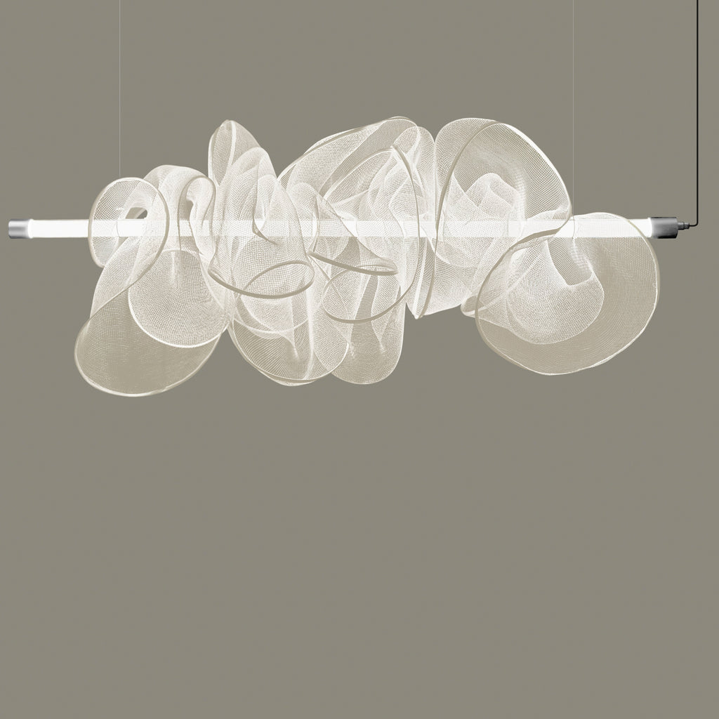 Like real clouds, each cloud has a distinct, handmade, random shape. And this is Cort's hallmark, as if it had a life of its own, each luminaire is unique, it can be altered effortlessly, it plays with change. He has achieved with just a veil what time achieves by playing with water and wind.