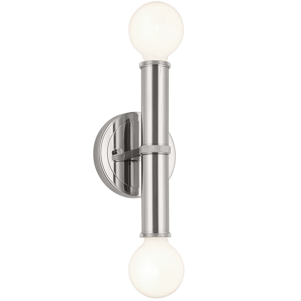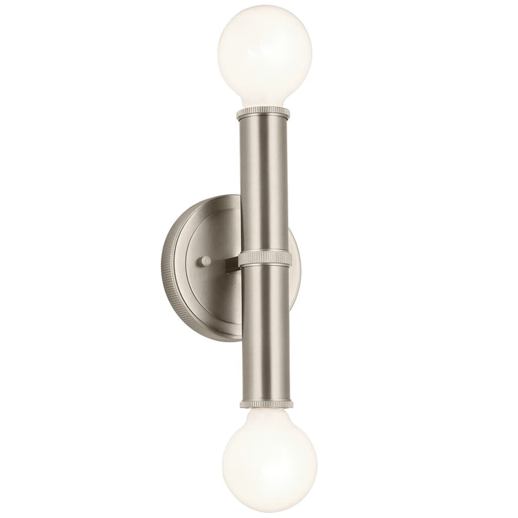 The Torche 2 light wall sconce is the ideal accent for any room. Its subtle, fine-ribbed detailing is inspired by the soft modern aesthetics of classic hardware. In brushed nickel, Torche easily complements a variety of styles. Effortlessly modernize your space with soft, trendy lighting A warm-toned silver finish with a brushed texture, brushed nickel creates an interesting interaction of light and shadow Modernize space by pairing with globe-shaped bulbs (not included) Mount horizontally or vertically Perfect in your entryway, flanking your fireplace, bed or vanity; use in multiples along a hallway Takes two E26 up to 60W G25 bulbs or equivalent LED bulbs.