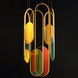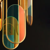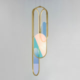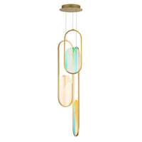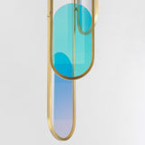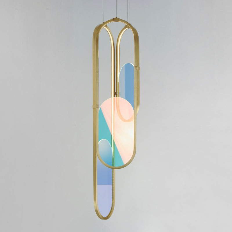 Minimalist in design but loud in its statement, oval frames in Natural Aged Brass illuminate floating dichroic glass panels. Subtle iridescent hues become more vivid as the panels layer adding a colorful element to the design. Intentionally designed with various dimensions for the panels, they can be fixed together in polygonal configurations, or simply free-float on the thin low voltage cables that suspend each frame.