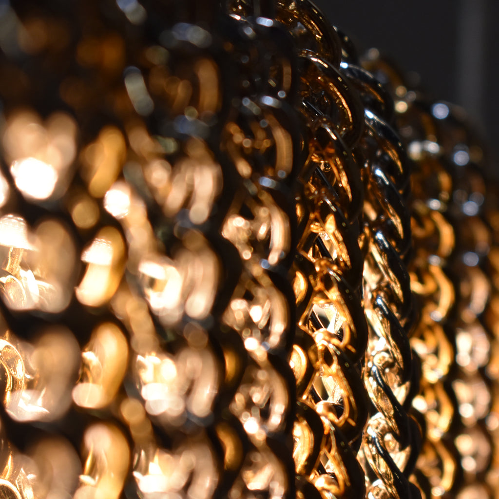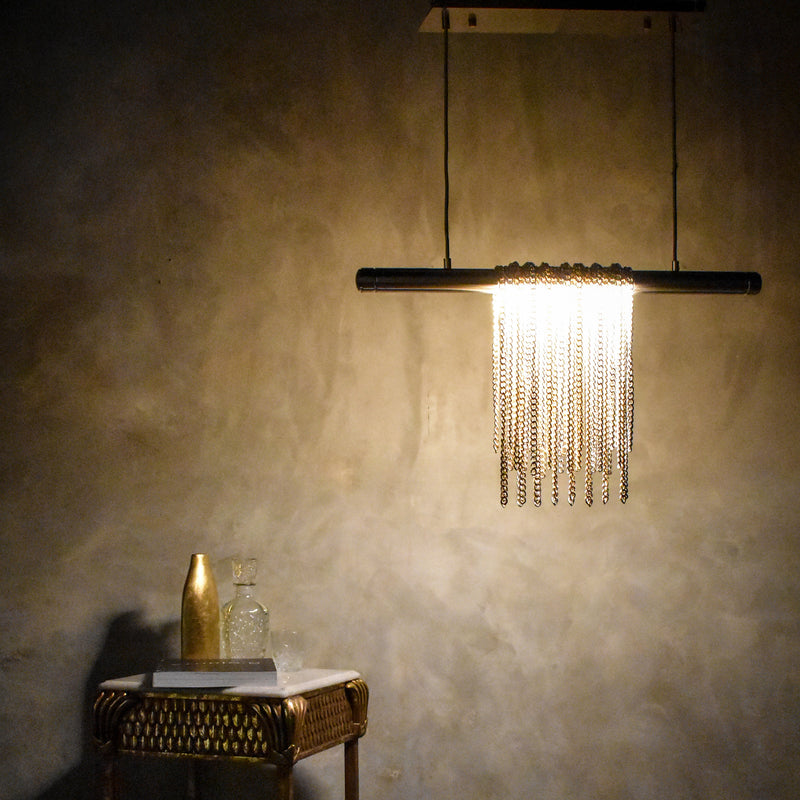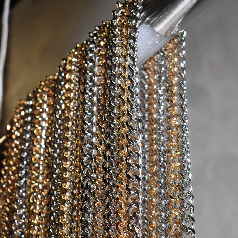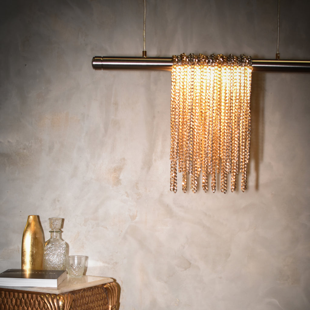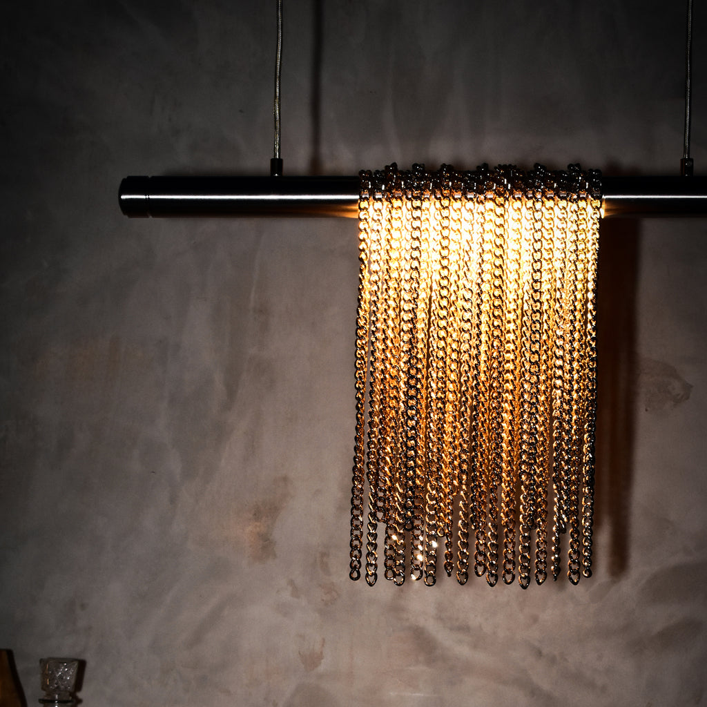 With a nod to the art and fashion world, the sculptural-art luminaire, Trapeze, showers LED light downward through glistening flat chain links finished in Polished Silver and Gold draped randomly over a Satin Nickel cylindrical bar. The power cord in gold and silver thread complements the fixture's finishes.