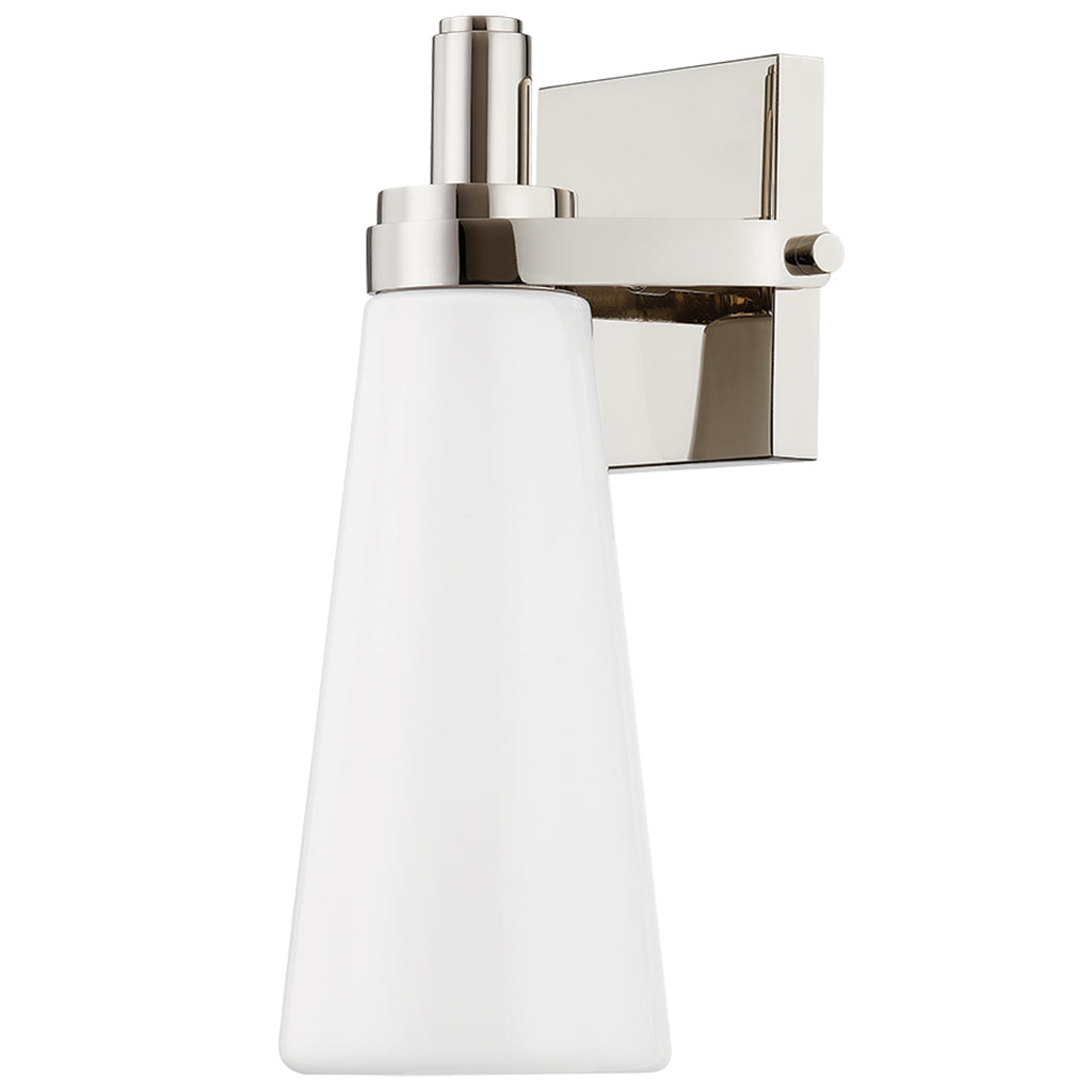 Form meets function in this simple yet refined sconce. The conical opal glossy glass shade of Trude tapers into a wider opening at the bottom, creating a powerful downlight. Rather than a traditional arm back, the upscale mechanical metalwork nods to mid-century modern design aesthetics. The frame is available in Aged Brass or Polished Nickel for a more classic or contemporary finish.