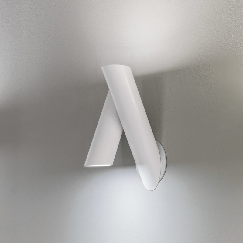 Wall lamp made from extruded aluminum with tubular element. Rotatable and adjustable. Available in different color versions, all one color or with two matching colors. Opal plexiglass diffusers.