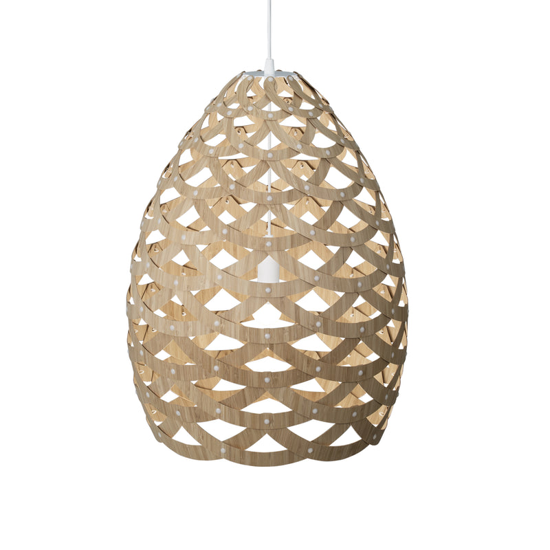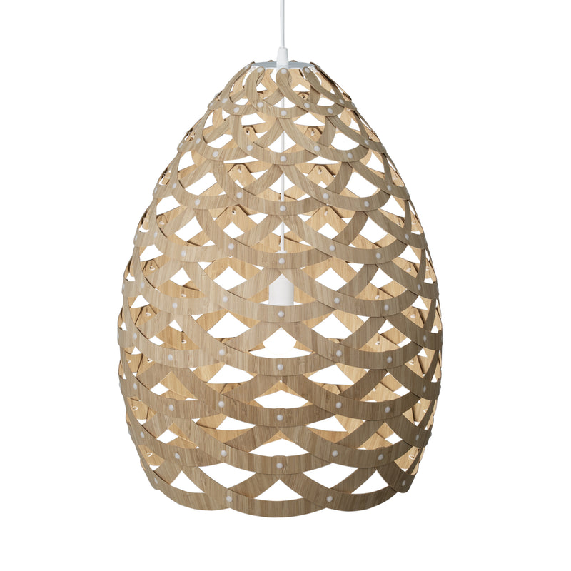 Tūī are the real characters of Aotearoa’s native bush. They hurtle through the bush with drumming wing-beats, miraculously avoiding branches whilst maintaining their cool charm. Their song is like no other: a series of clicks, gurgles and resonant, bell-like notes...some off our hearing scale! They have two dangling white wattles on their throats and around their shoulders is a necklace of interwoven rings which is the inspiration of our Tūī light. Half rings of bamboo are woven into a basket form that would sit perfectly over a dining table, kitchen counter or equally hanging in a stairwell or entrance void.