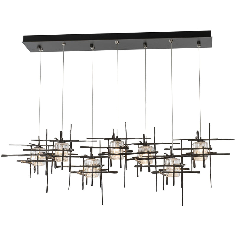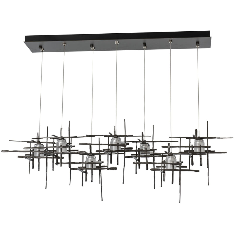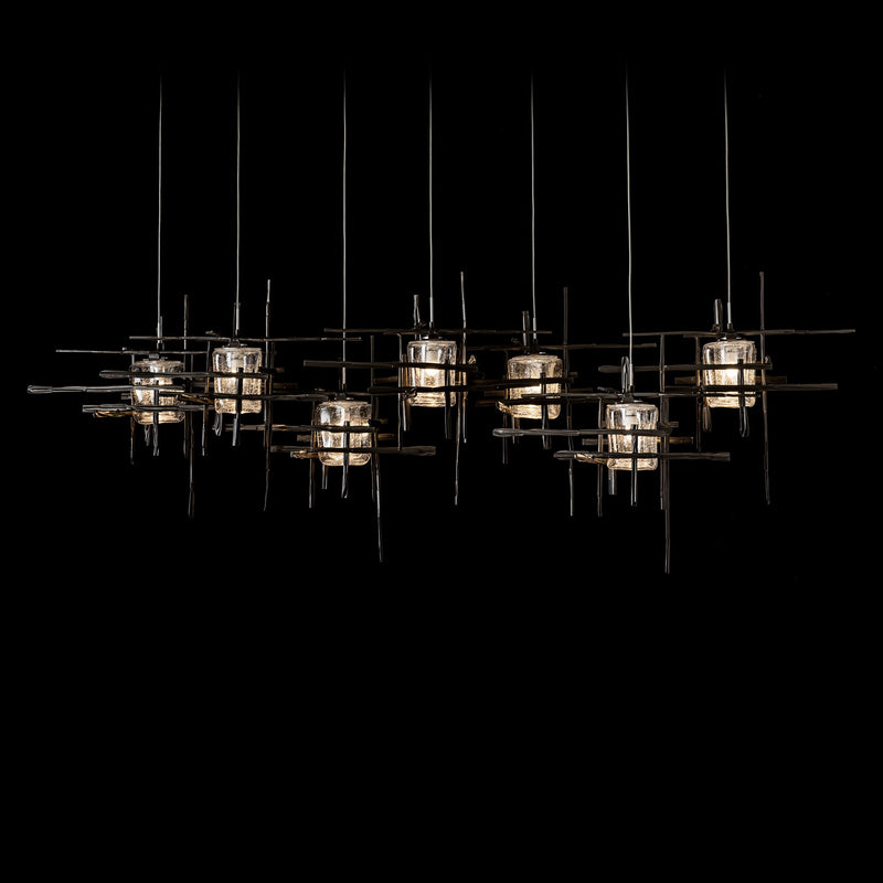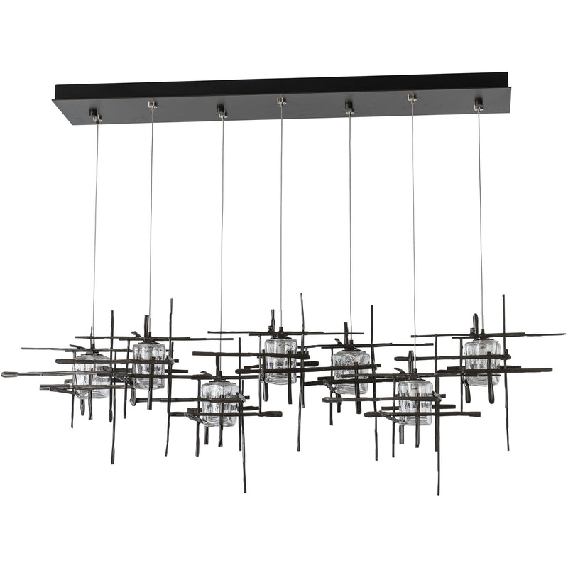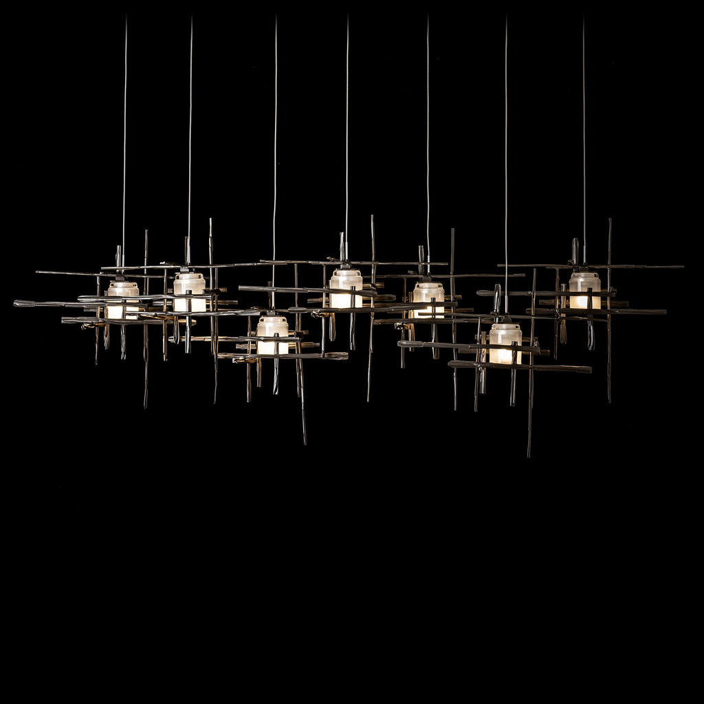 This 7-Light Tura with its rectangular canopy is a linear multi-port pendant, with both depth and dimension. Each intersecting piece is crafted from from annealed aluminum that are hand textured using a trip hammer and custom dies. This Tura Pendant's shades are made of simple, thick cylinders of frosted or seeded glass. Available in all standard finishes.