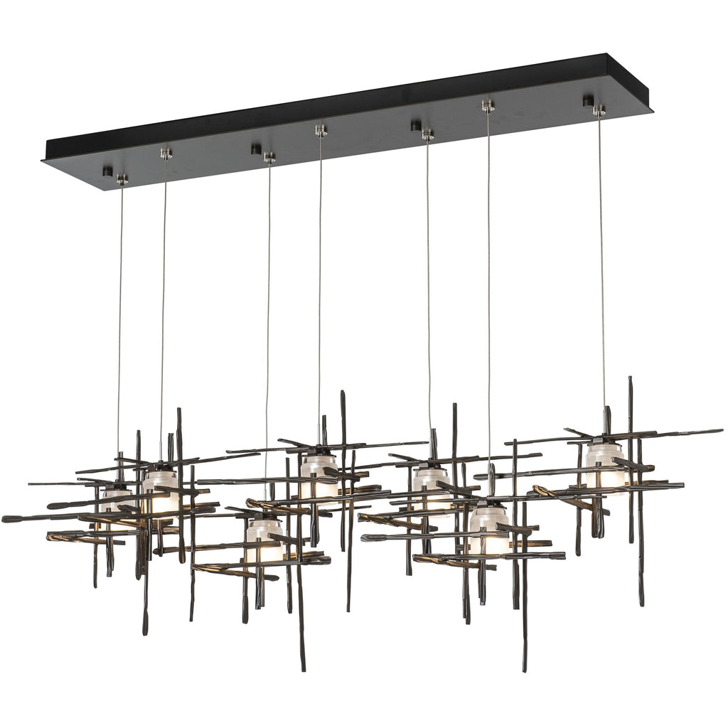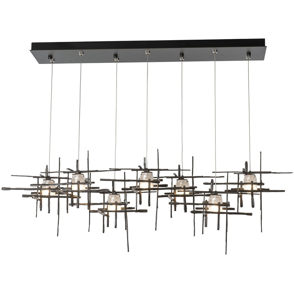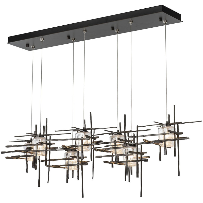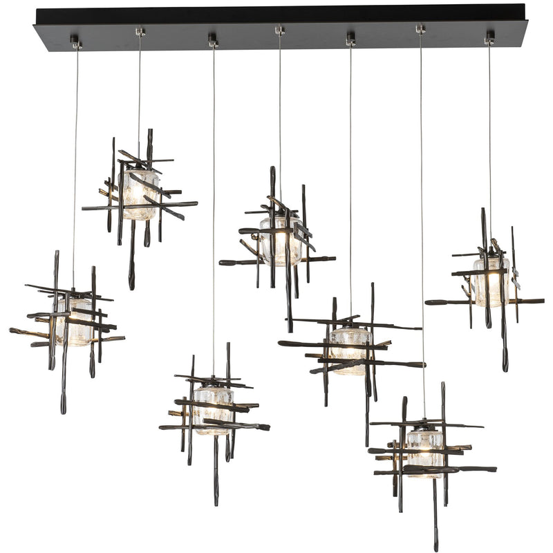 This 7-Light Tura with its rectangular canopy is a linear multi-port pendant, with both depth and dimension. Each intersecting piece is crafted from from annealed aluminum that are hand textured using a trip hammer and custom dies. This Tura Pendant's shades are made of simple, thick cylinders of frosted or seeded glass. Available in all standard finishes.