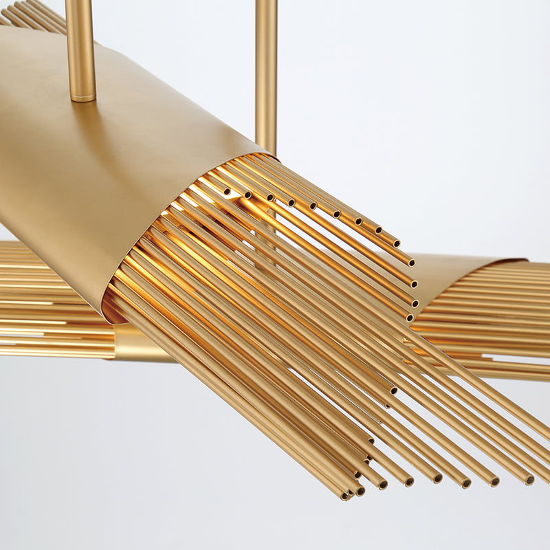 Fused metal rods are adhered to the center where the light source is neatly encased. Creating a wave effect, the Umura adds motion to its design despite being a fixed form. Each metal rod is highlighted by the central light, creating a grazing effect for a polished, rich composition