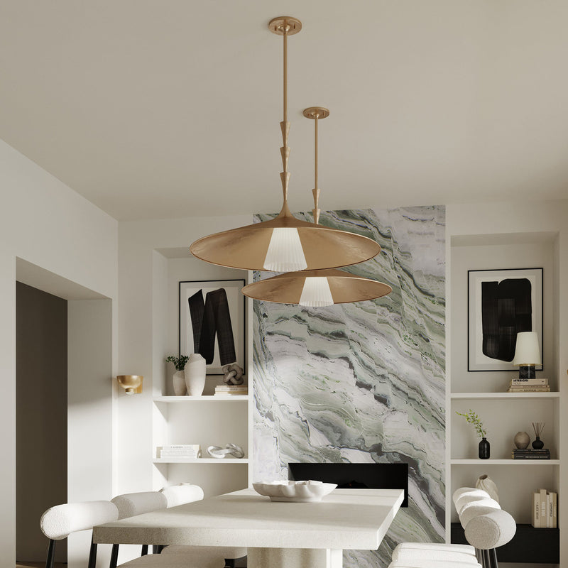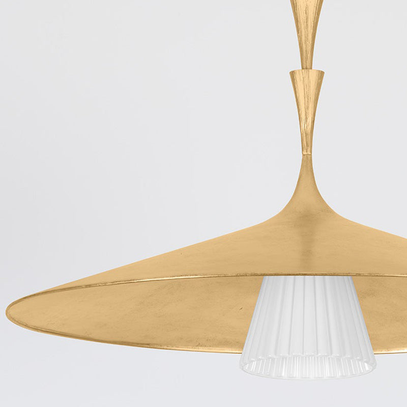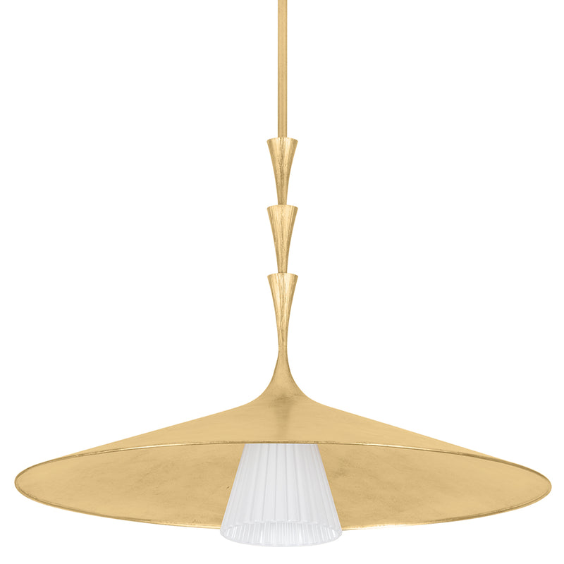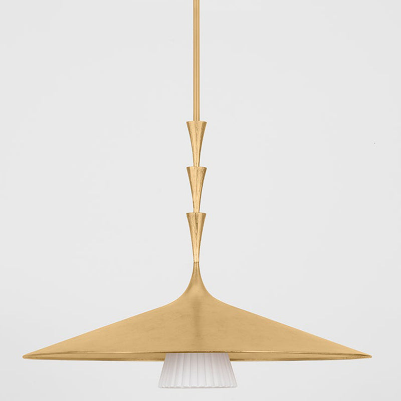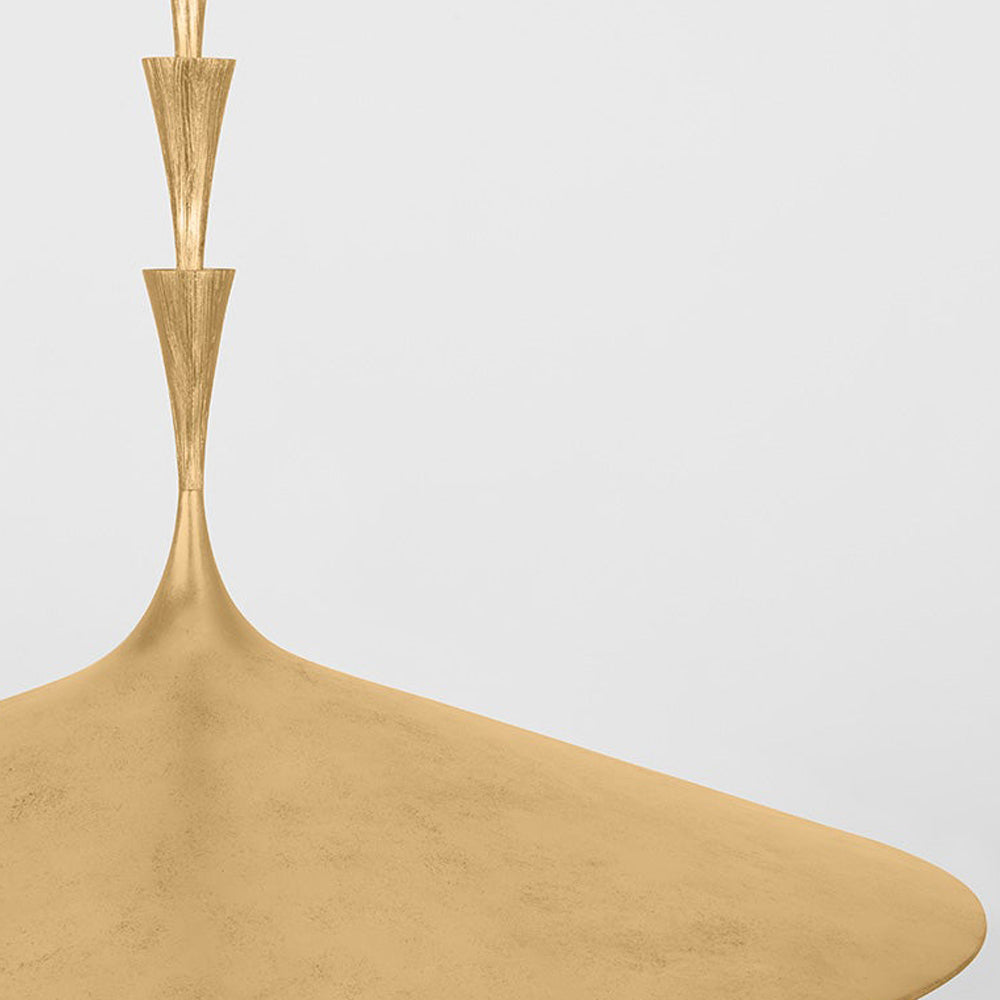 Nature meets geometry in the elevated Vails Gate. This pendant features a repetitious stack of flared trumpet forms, reminiscent of the nodes on a flower stem. Fluting details add depth to the symmetrical design, nodding to its organic origins. Finished in Vintage Gold Leaf, Vails Gate is available as a pendant light in two sizes and a 1-light sconce.
