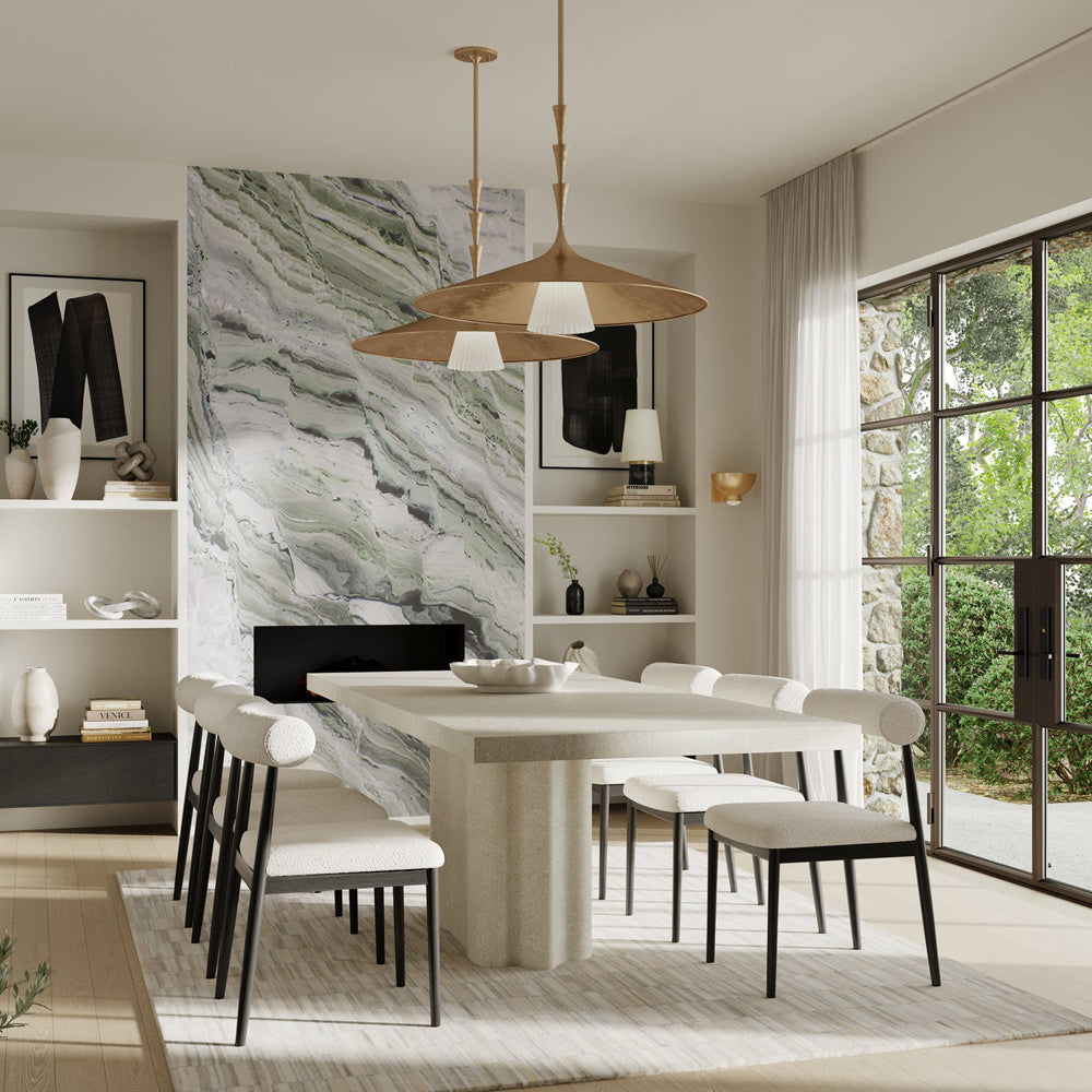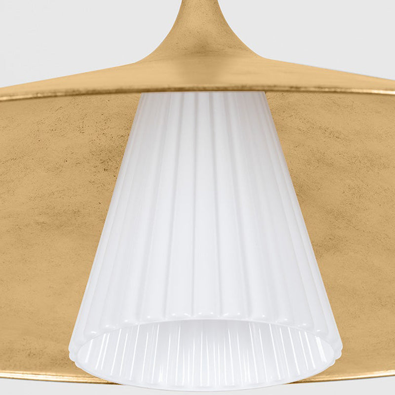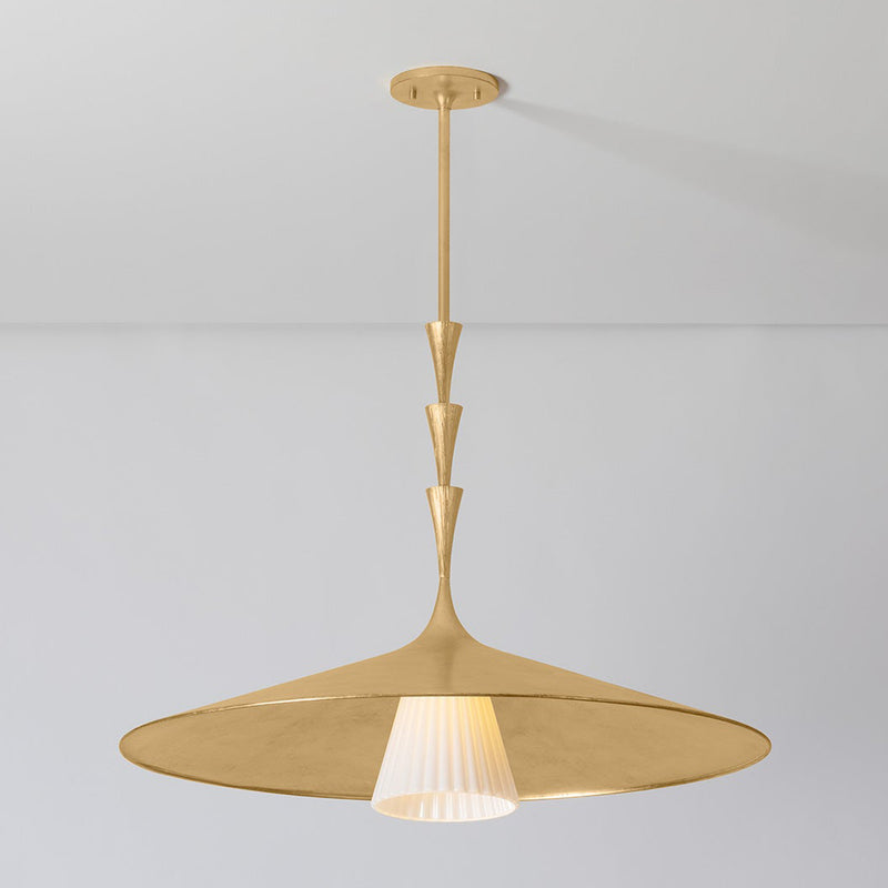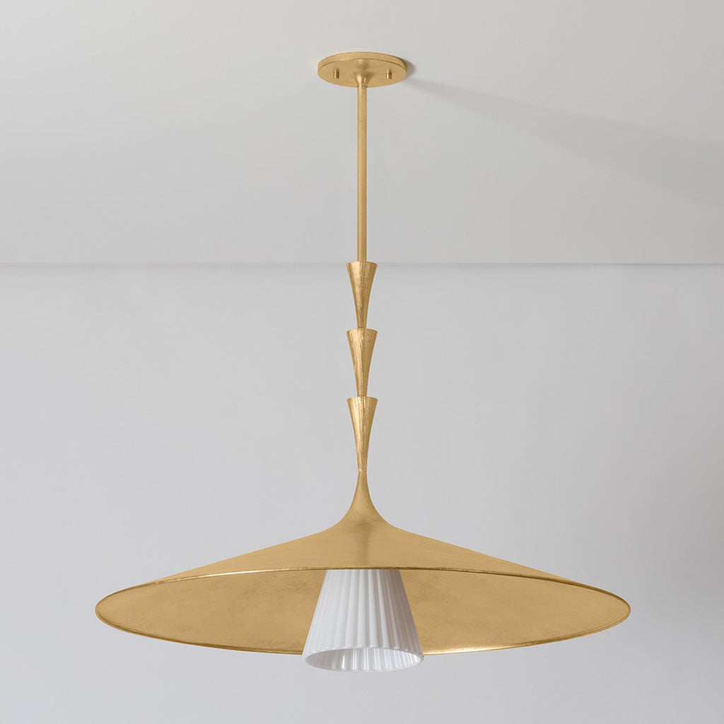 Nature meets geometry in the elevated Vails Gate. This pendant features a repetitious stack of flared trumpet forms, reminiscent of the nodes on a flower stem. Fluting details add depth to the symmetrical design, nodding to its organic origins. Finished in Vintage Gold Leaf, Vails Gate is available as a pendant light in two sizes and a 1-light sconce.