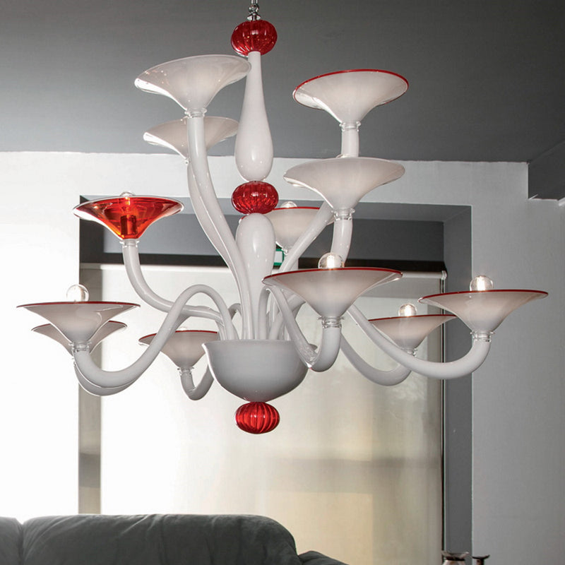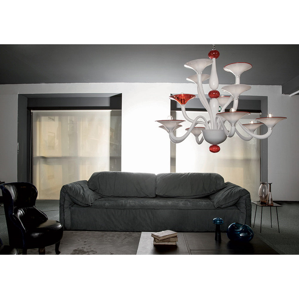 The Venezia Chandelier by Mazzega is apt for grand and contemporary settings. This uniquely designed chandelier has an E12 bulb and is available in an appealing and contrasting white, red finish that adds a distinct charm to the interiors. Easy to hang on to the ceiling of your luxurious and royal living room, this luminaire strikes a stylish statement. The curvy tentacle-like branches bloom into flower-like diffusers which consist of the bulbs. A part of the hand-worked glass chandeliers, this light fixture is ideal to place in vintage style living room, hallway, entryway etc.