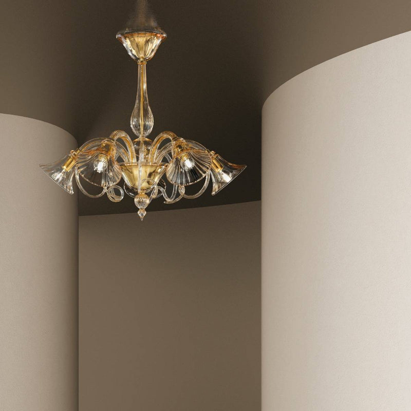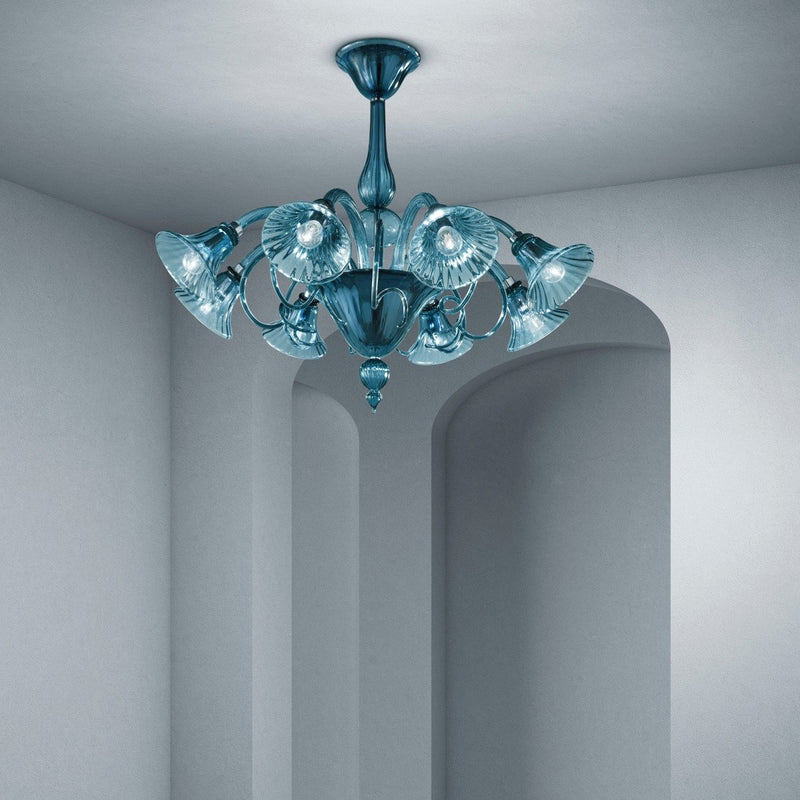 Elegantly designed, the Venier Chandelier features an elaborate design that is characterized by curled decorative elements. This chandelier has multiple arms in a lovely bell shape that directly throws light to create a warm and naturally beautiful ambiance. It is offered in multiple sizes like small, medium, large and X-large. Both polish gold and polish chrome finish add a dazzling touch to the chandelier. This chandelier is available in various exquisite colors including amber, blue, grey, clear, smoke, ocean, milk white clear, and clear and 24kt gold.