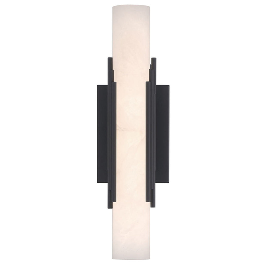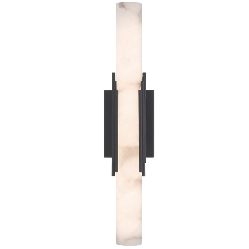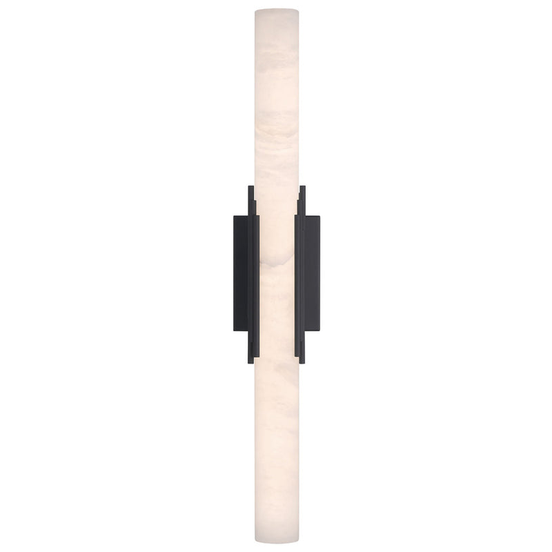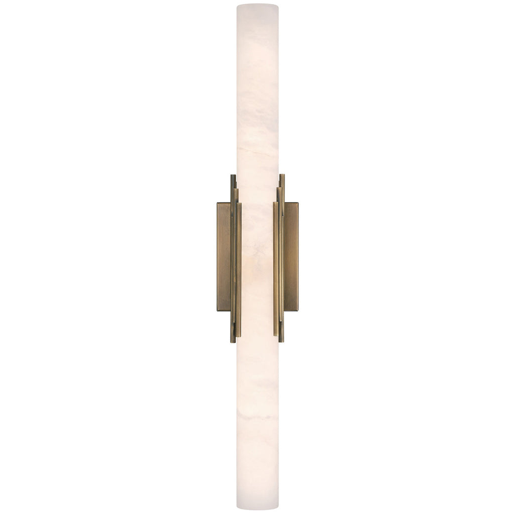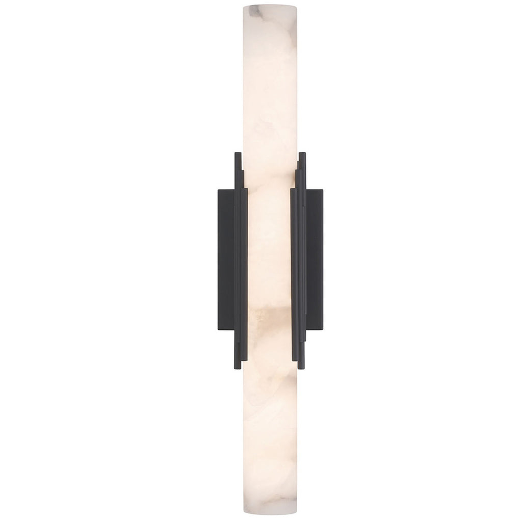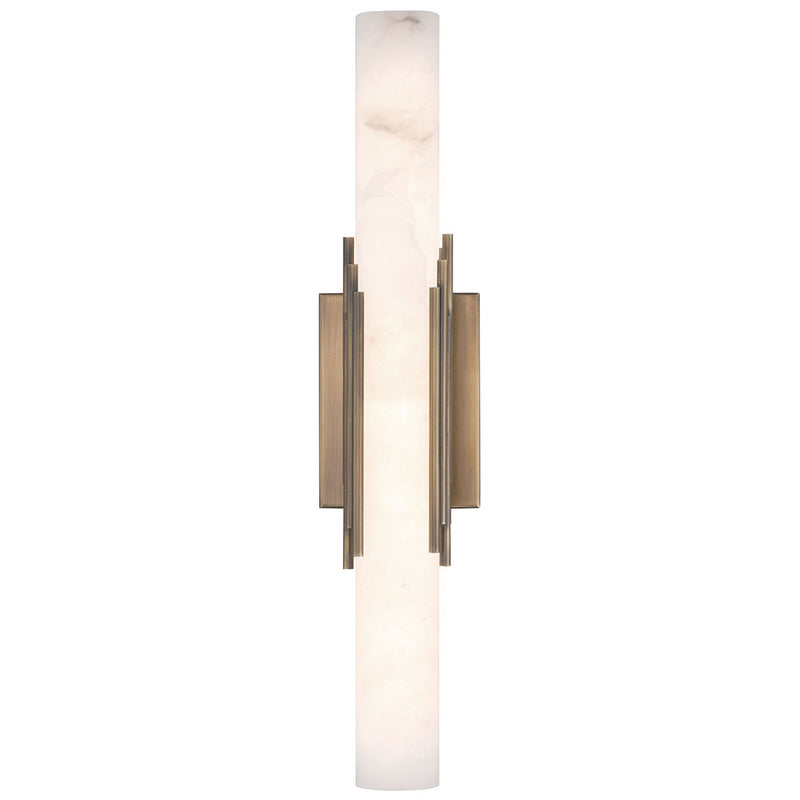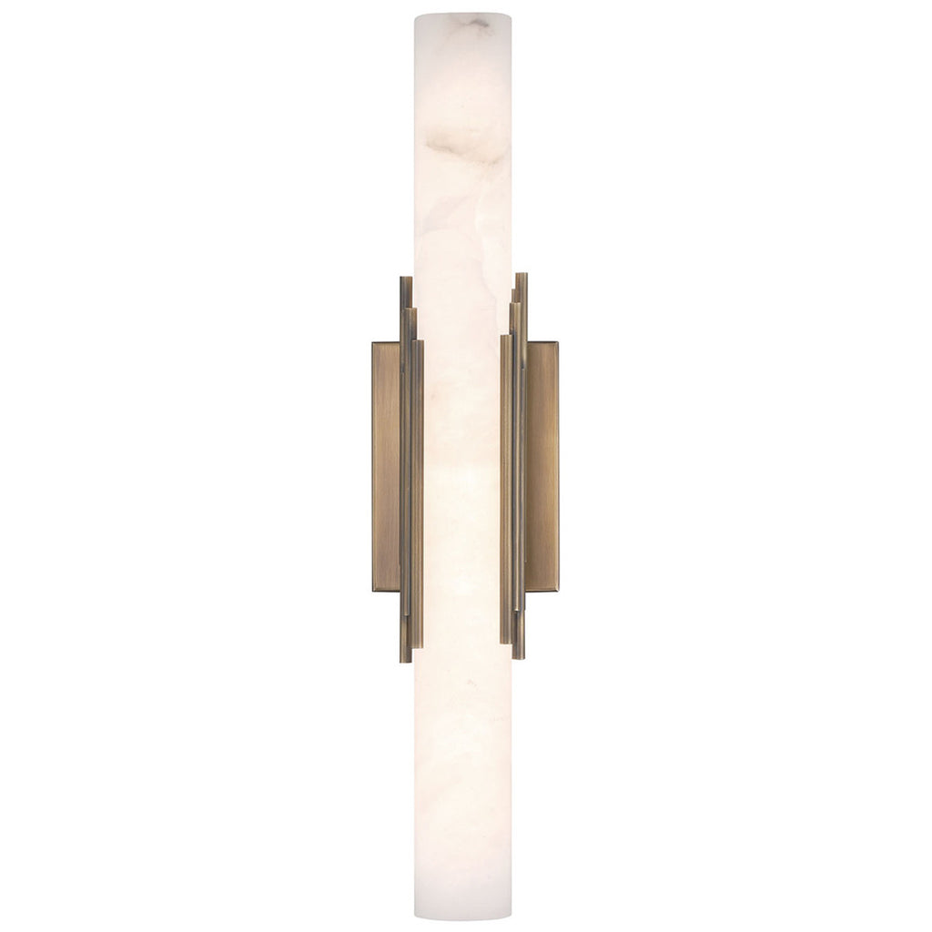 The elegance of the Venna indoor wall sconce is generously shared in these indoor pieces. A cylinder of natural alabaster is cored to reveal the intricate clouds and veins of the stone, beautifully illuminated from within. A series of sleek rods encircle the form, blending the warmth of metal with the organic elegance of the alabaster, creating a striking balance between durability and ethereal beauty for indoor settings