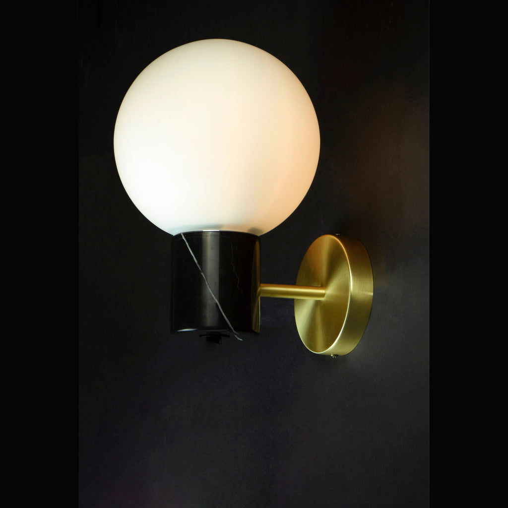 Inspired by both Mid Century Modern and Scandinavian Contemporary this collection spans a large breadth of today's interior design. Straight tubing finished in Satin Brass supports hand blown Satin White cased glass globes. Black accents of metal and Black marble add dramatic detail and upscale appeal.