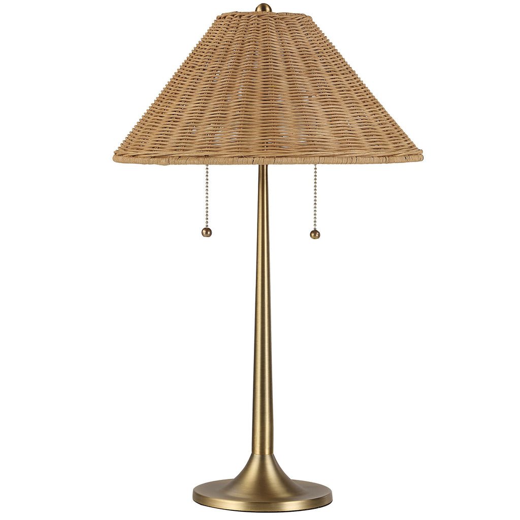 Boasting a timeless aesthetic, this classic table lamp marries natural rattan and dark antique brushed brass to deliver a transitional touch to any space. Its woven shade softly filters light for an ambient glow while its richly patinaed body warms up the room with old-world charm. Include one or a pair in your decorating scheme for an instantly adored update.