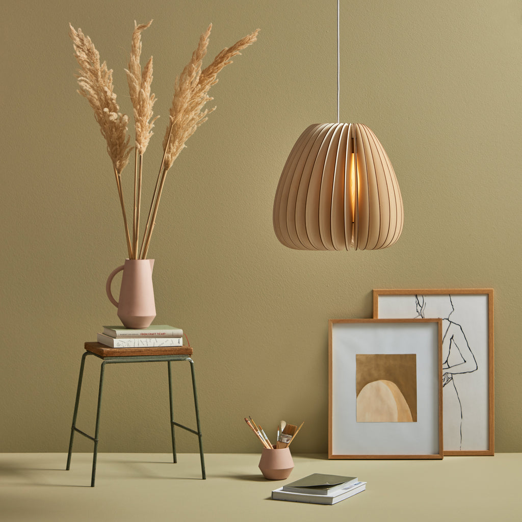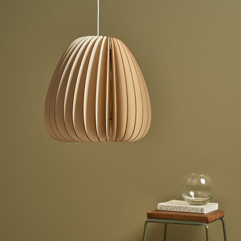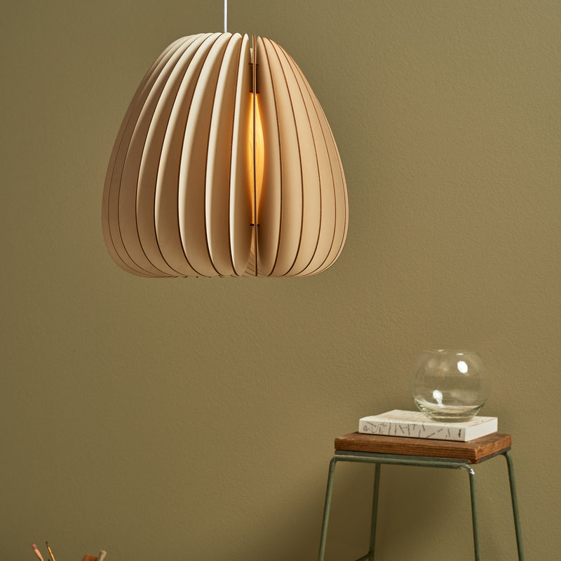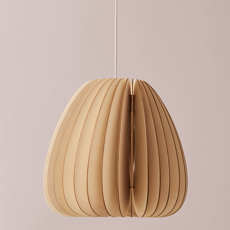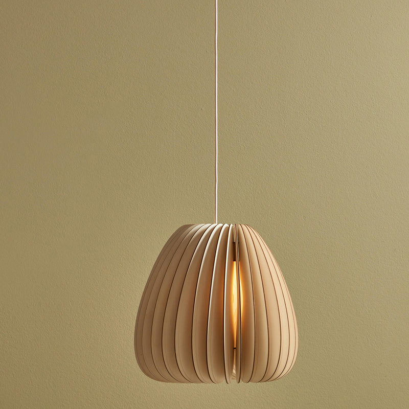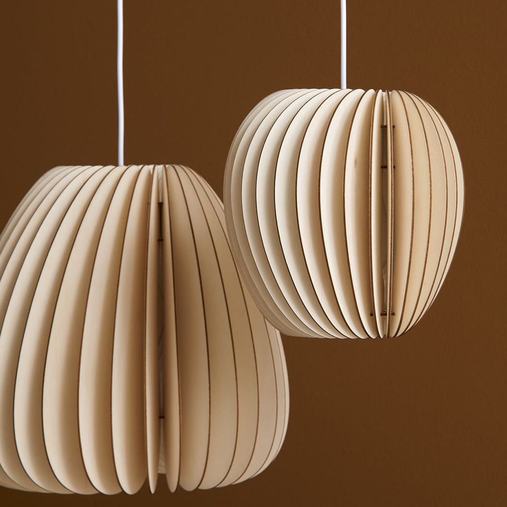 Pirum, Secundum and Volum: Three lamps that stand for naturally warm light. All three lights are constructed by the same principles and yet every lamp stands out with its own special shape and character. The intricate structure of the lamp allows the light to subtly shine through the thin wooden slats and cast a glare-free light which creates a natural ambience. The Series A is hand manufactured of untreated, sustainable wood in our own studio in Lübeck, Germany.