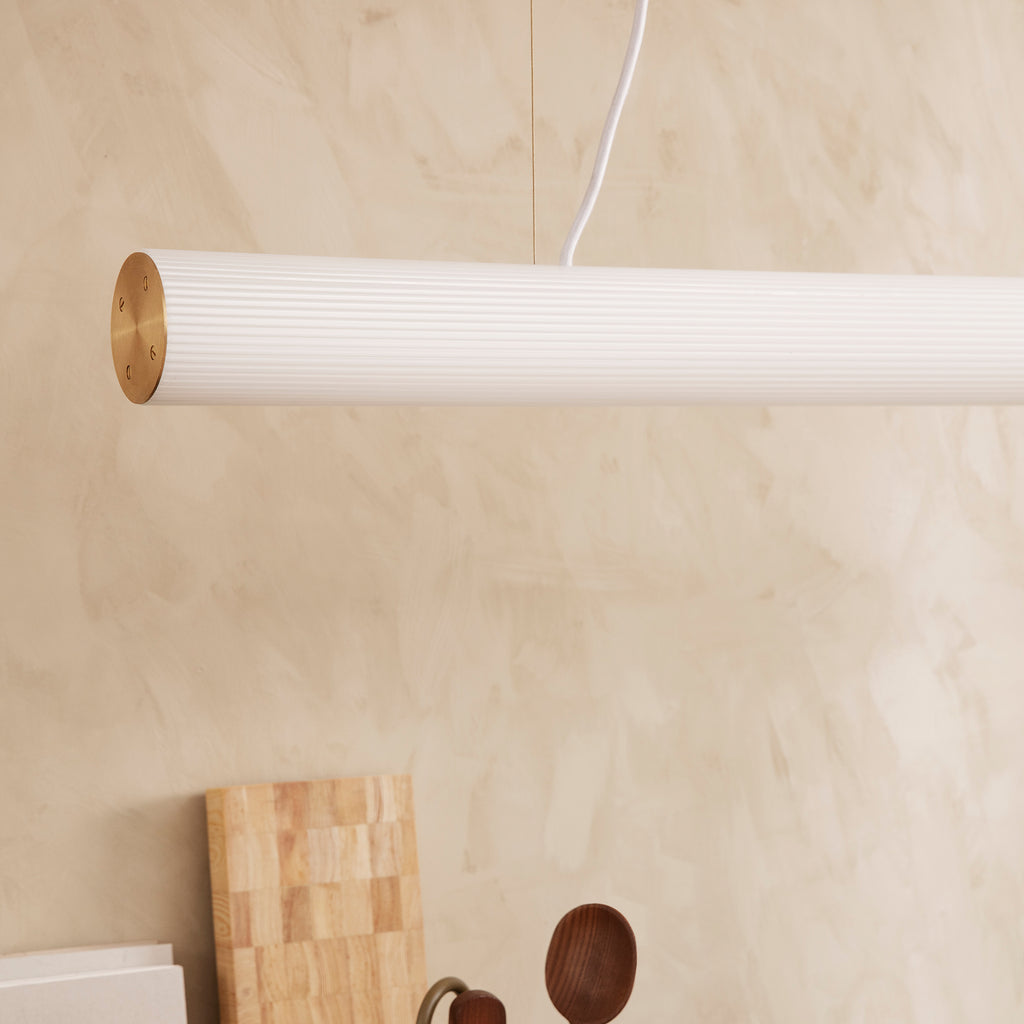 Fusing textural complexity with modern simplicity, the Vuelta Pendant features cylindrical translucent glass with a distinct rippled surface and brushed metal finishes. With an LED light source that emits a soft, diffused light, the Vuelta Pendant comes with an adjustable dimmer remote for ultimate ambiance control. Use the pendant on its own, or hang multiple lamps in a row for a bright, uniformed statement.