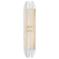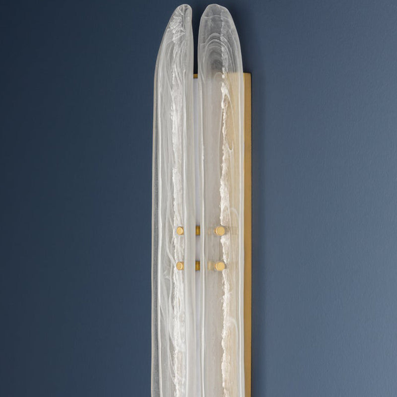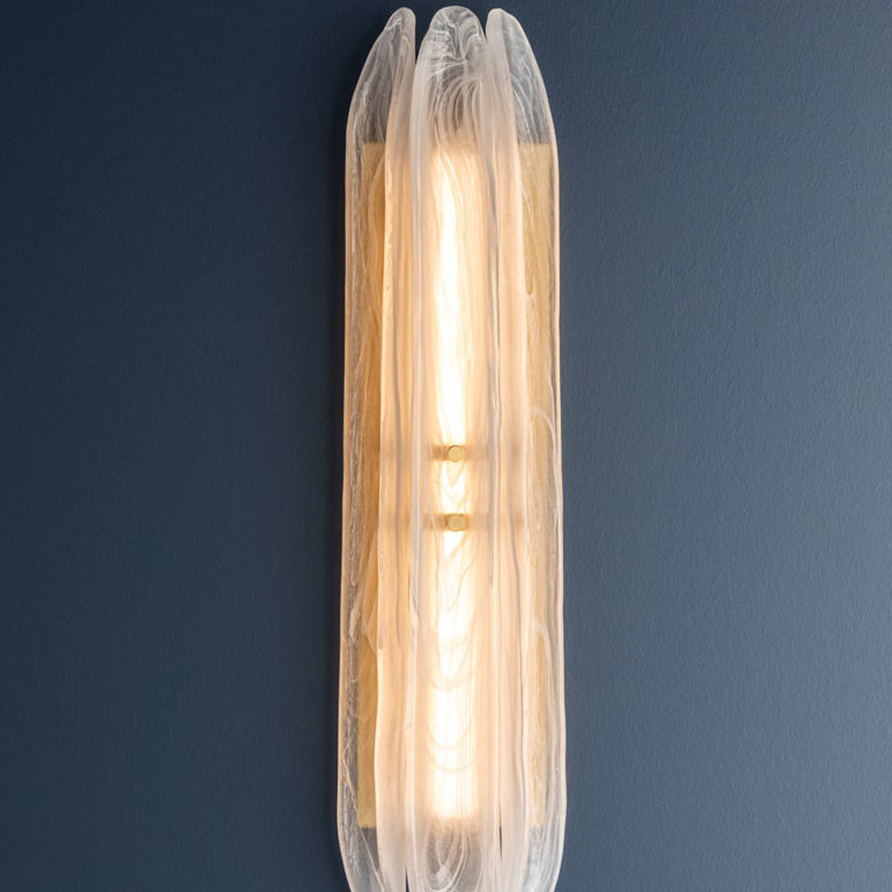 Elevating a minimalist silhouette, the Westtown sconce uses exquisite materiality to create a subtle statement. Secured with small Aged Brass thumbscrews, long pieces of piastre glass are positioned before an LED light source. Internally etched with a white swirl pattern, the glass creates a soft light diffusion, perfect for a hallway or bathroom.