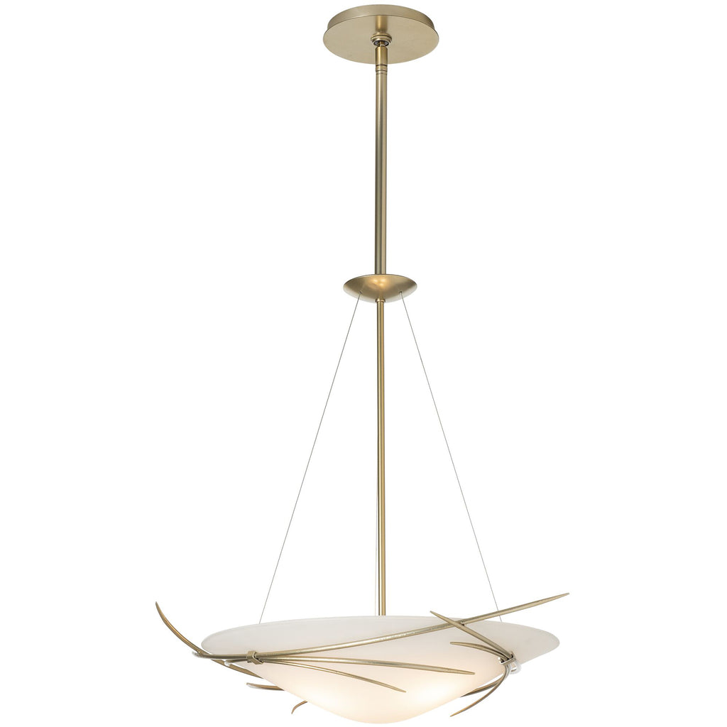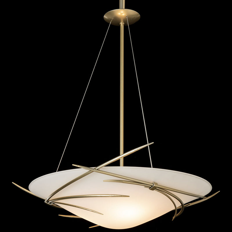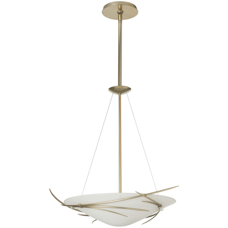 Multiple clusters of three wisps of curved and tapered steel are gathered below the lip of the Wisp Pendant's elegantly shaped glass bowl, creating a sense of movement in this classic design with a contemporary touch. Available in all standard finishes.